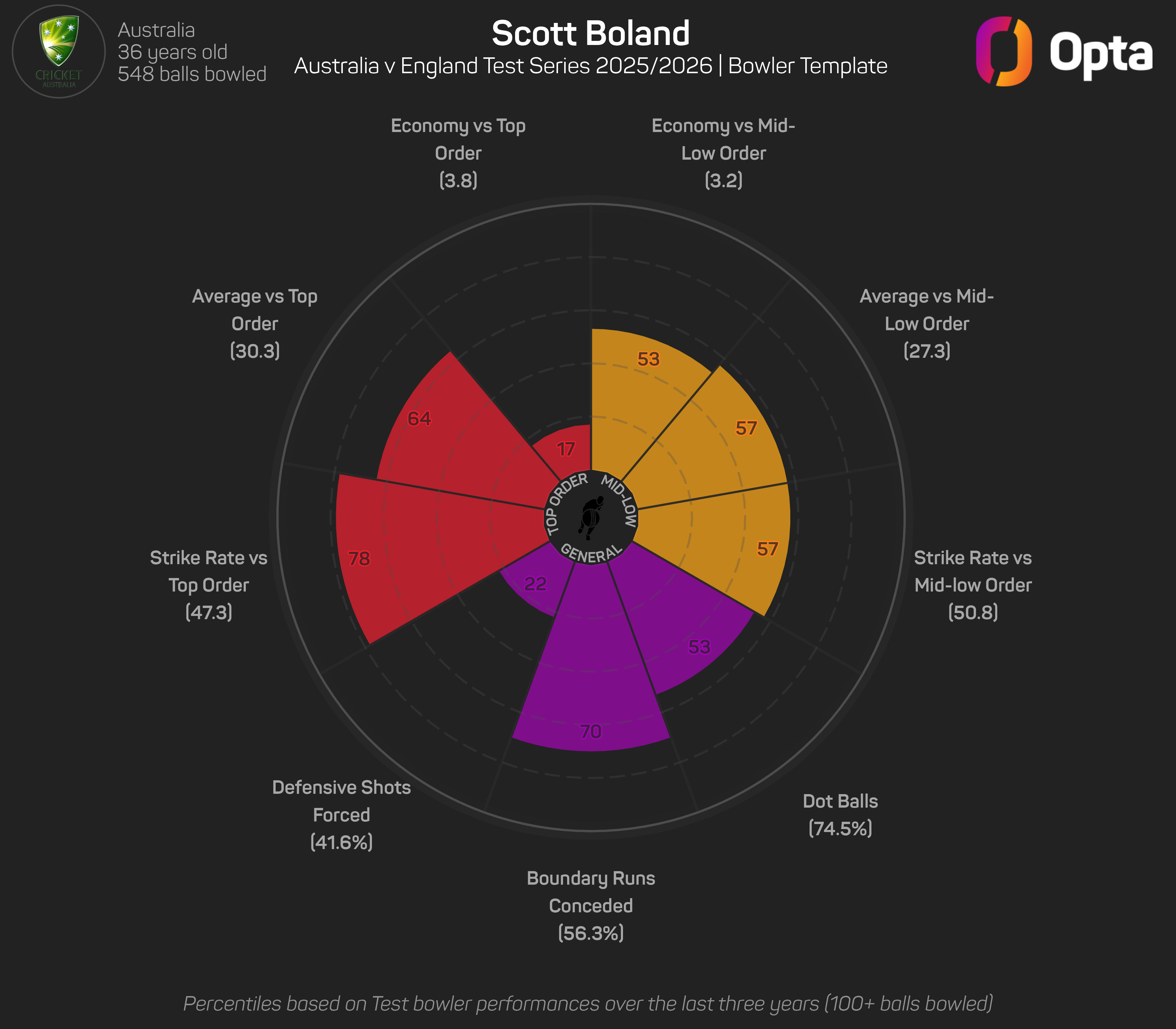 Boland has been one of the major beneficiaries of Carey standing up at the stumps, taking 11 wickets across the first three Tests – only Mitchel Starc (22) and Brydon Carse (14) have more.