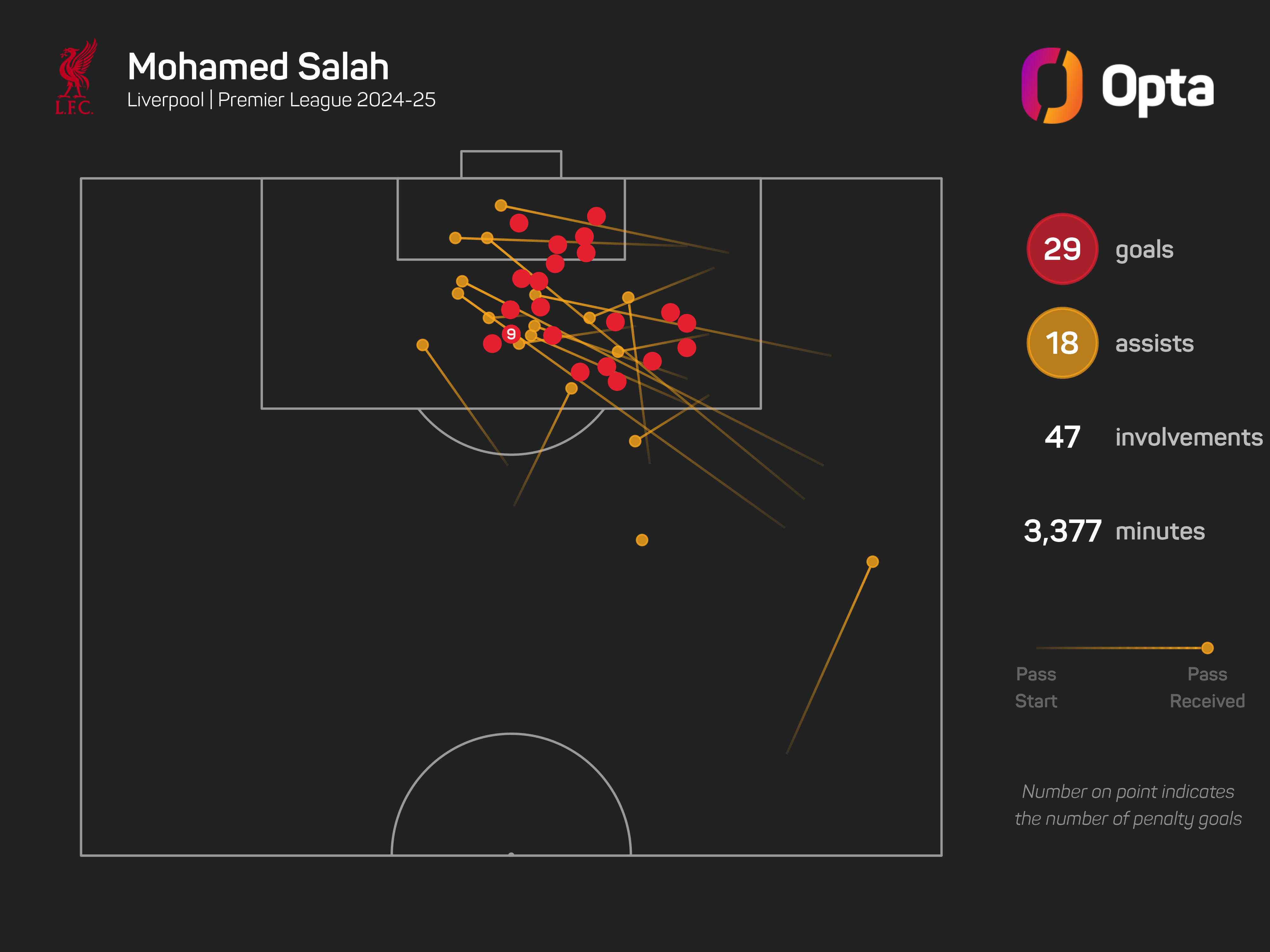 Mohamed Salah finished 2024-25 with 47 goal involvements overall (29 goals, 18 assists), equalling the Premier League record held by both Andrew Cole (1993-94) and Alan Shearer (1994-95), respectively.