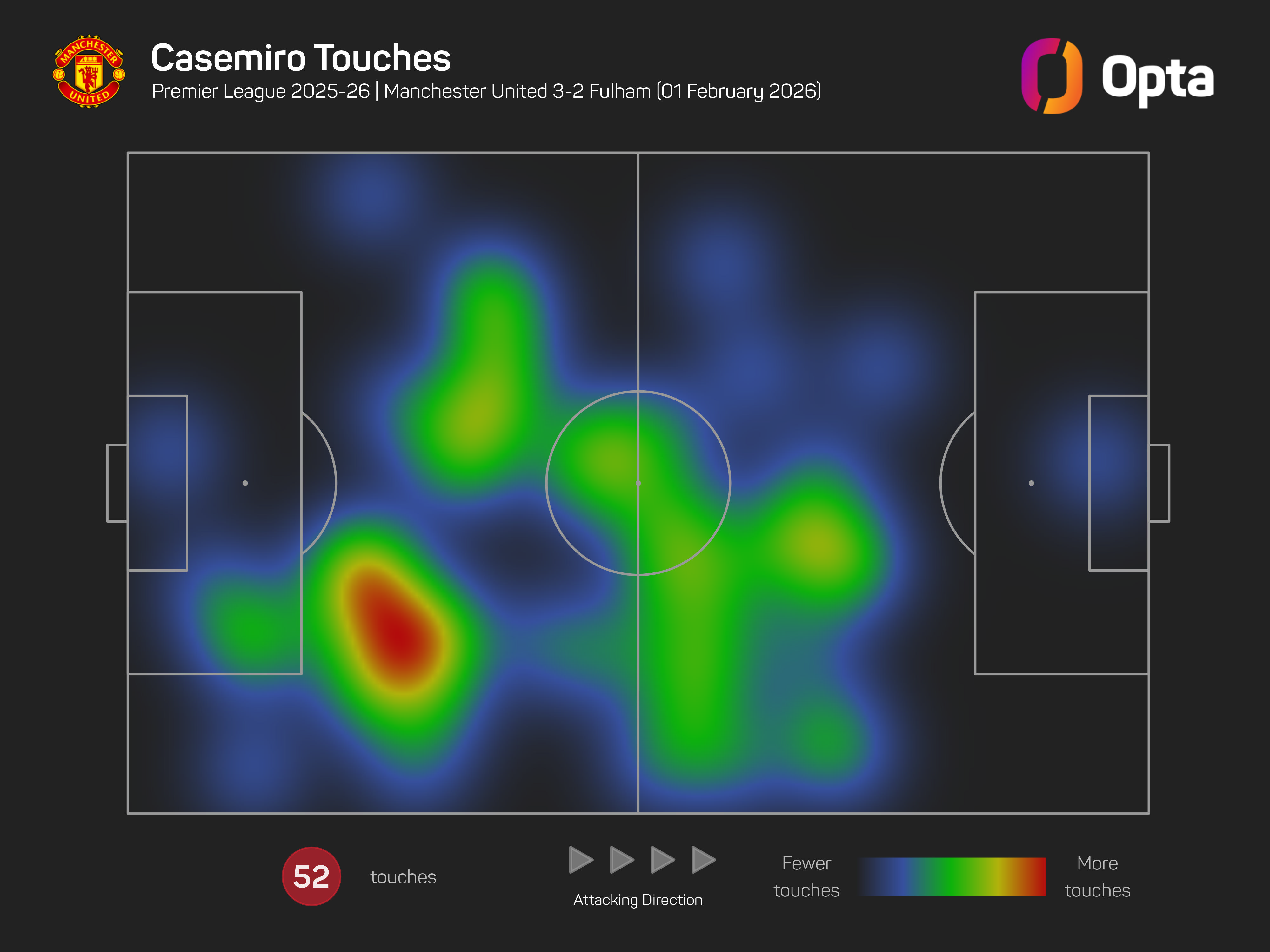 Casemiro has attempted 52 tackles this season, more than any other United player, winning 27 of those. He has won 108 duels, ranking behind only Cunha (117) and Patrick Dorgu (150).