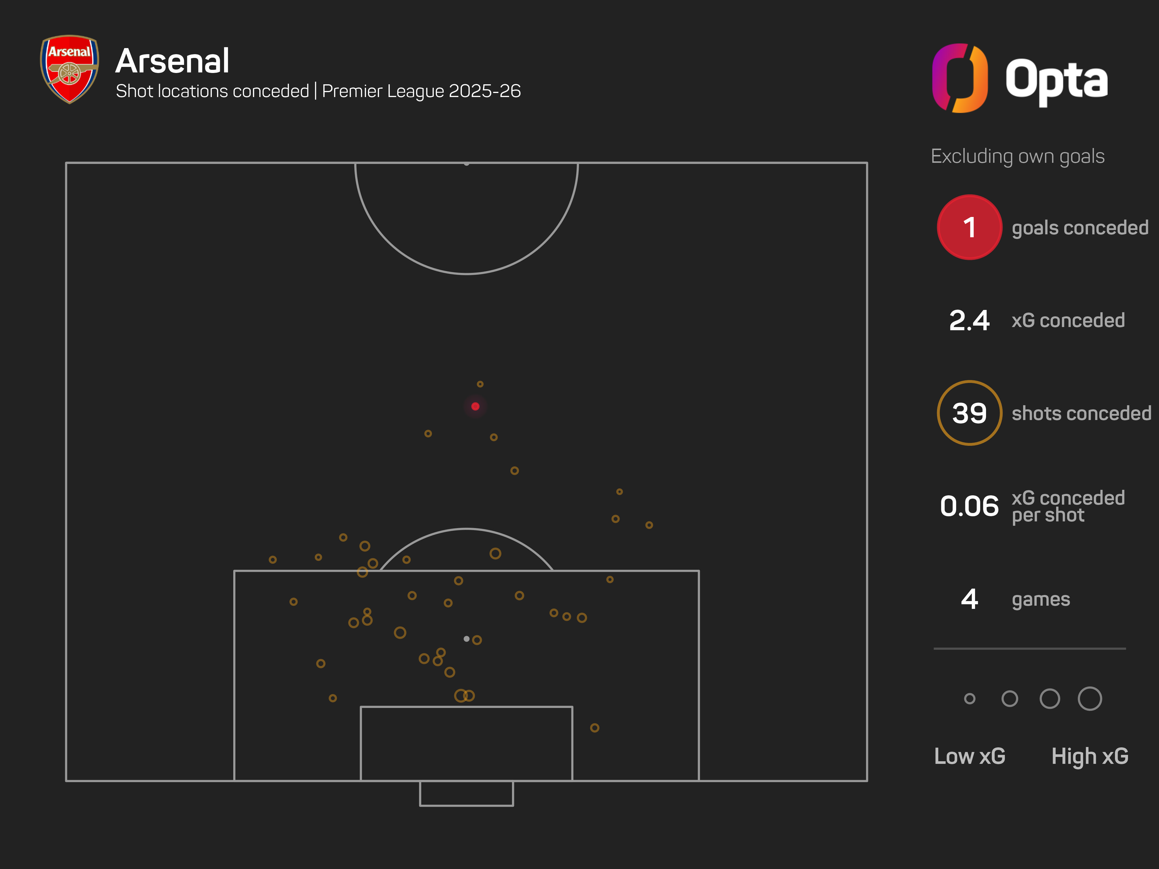 Arsenal have, however, faced 39 shots, which is more than Leeds United (38), Bournemouth (36), Liverpool (34) and the Magpies (26).