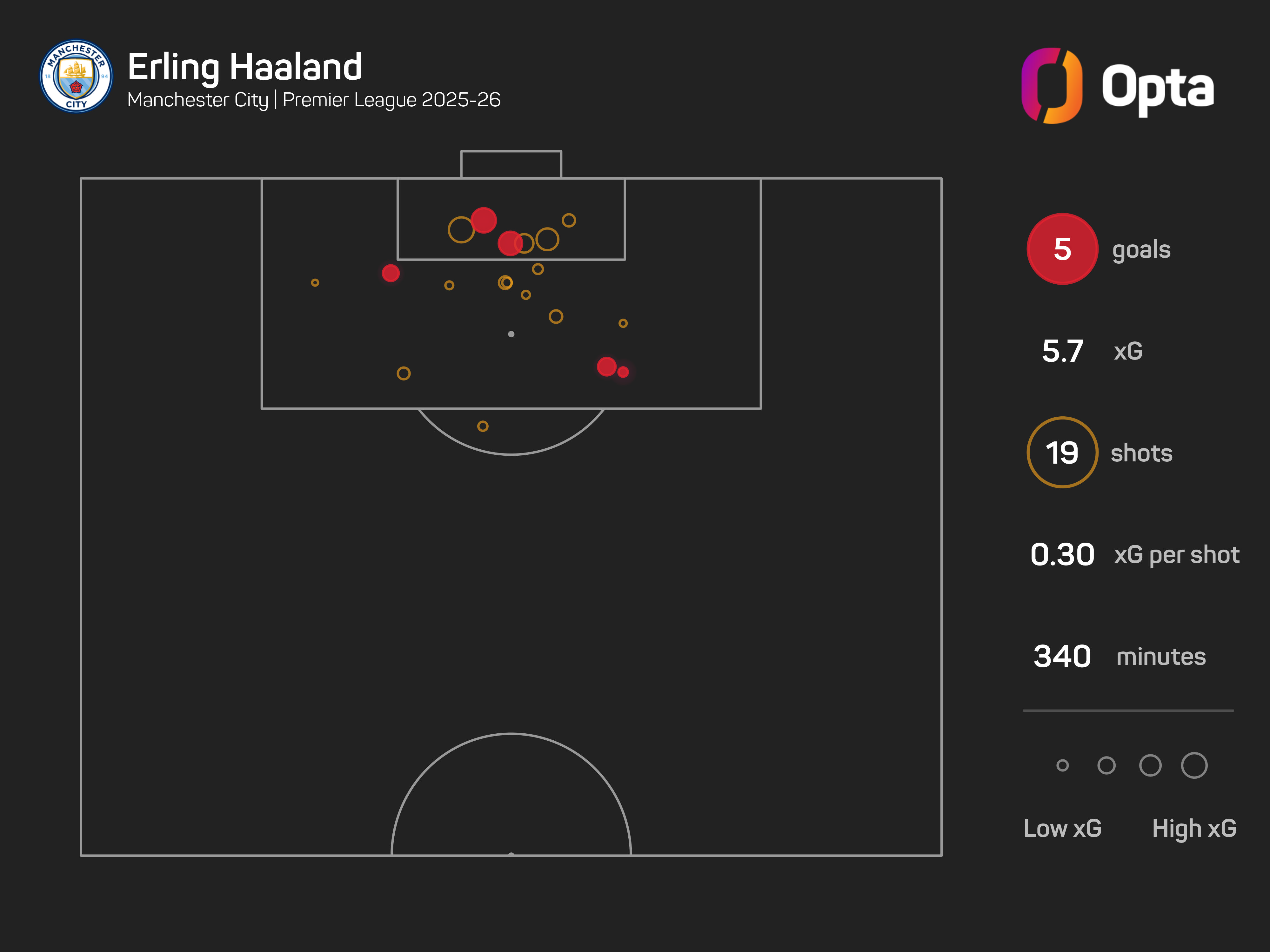 Haaland is the league's leading scorer, with five goals, while he has also had the most shots (19) and shots on target (eight).