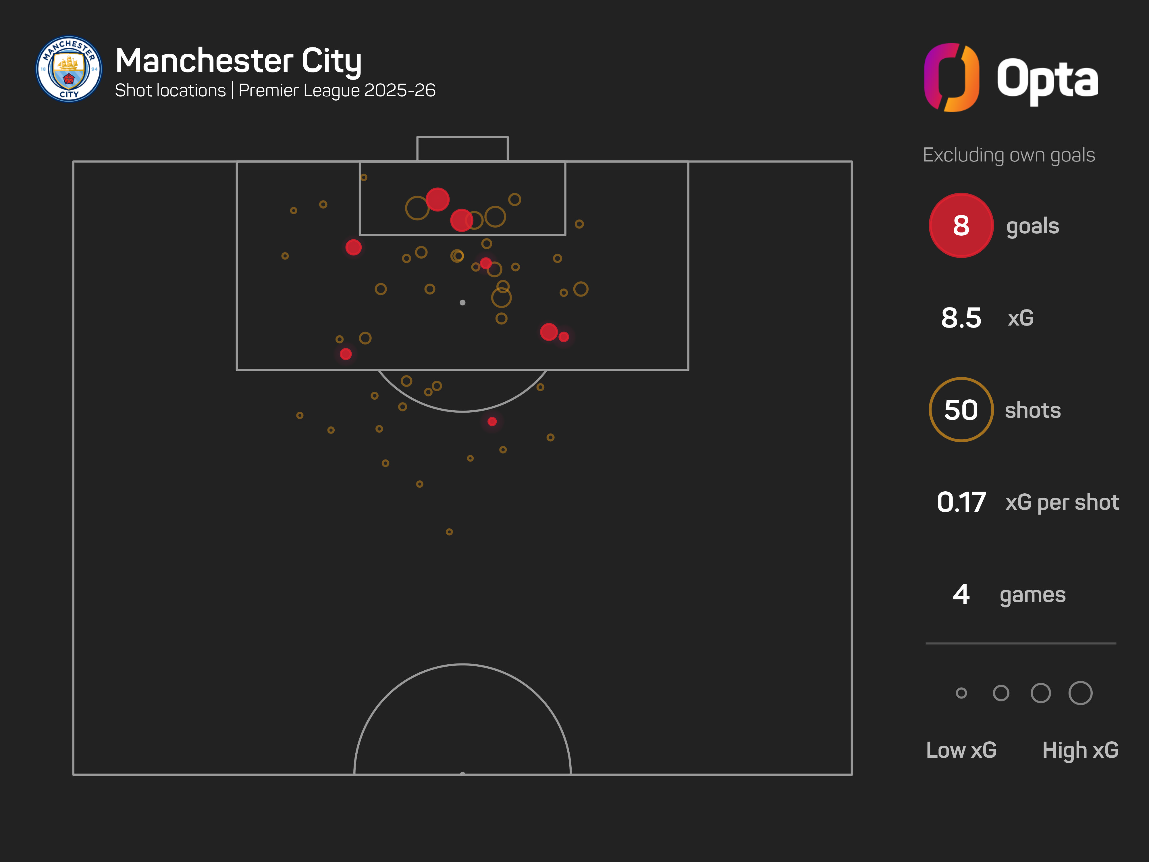 While Arsenal have been defensively resilient, they are going up against the team that leads the Premier League for expected goals (xG) this season, with City netting eight times from 8.5 xG. Arsenal rank fifth, with 6.5 xG.