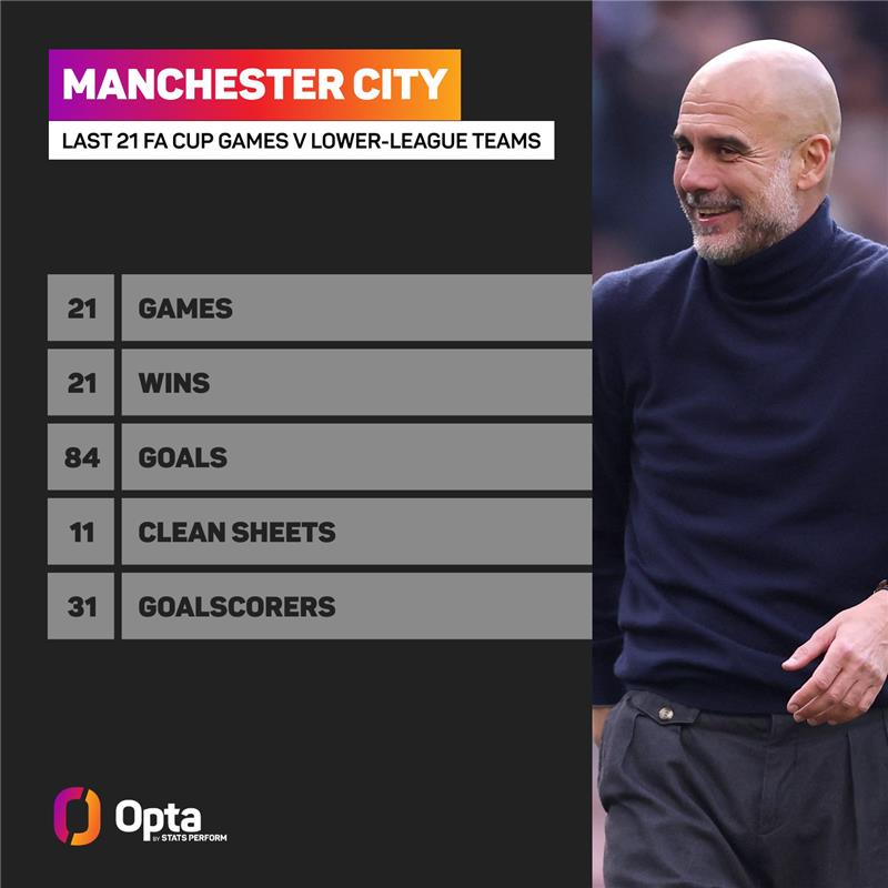 And against lower-league sides, City often come out on top. They have won their last 21 FA Cup matches against sides from outside the Premier League, scoring 84 goals and only conceding 11.