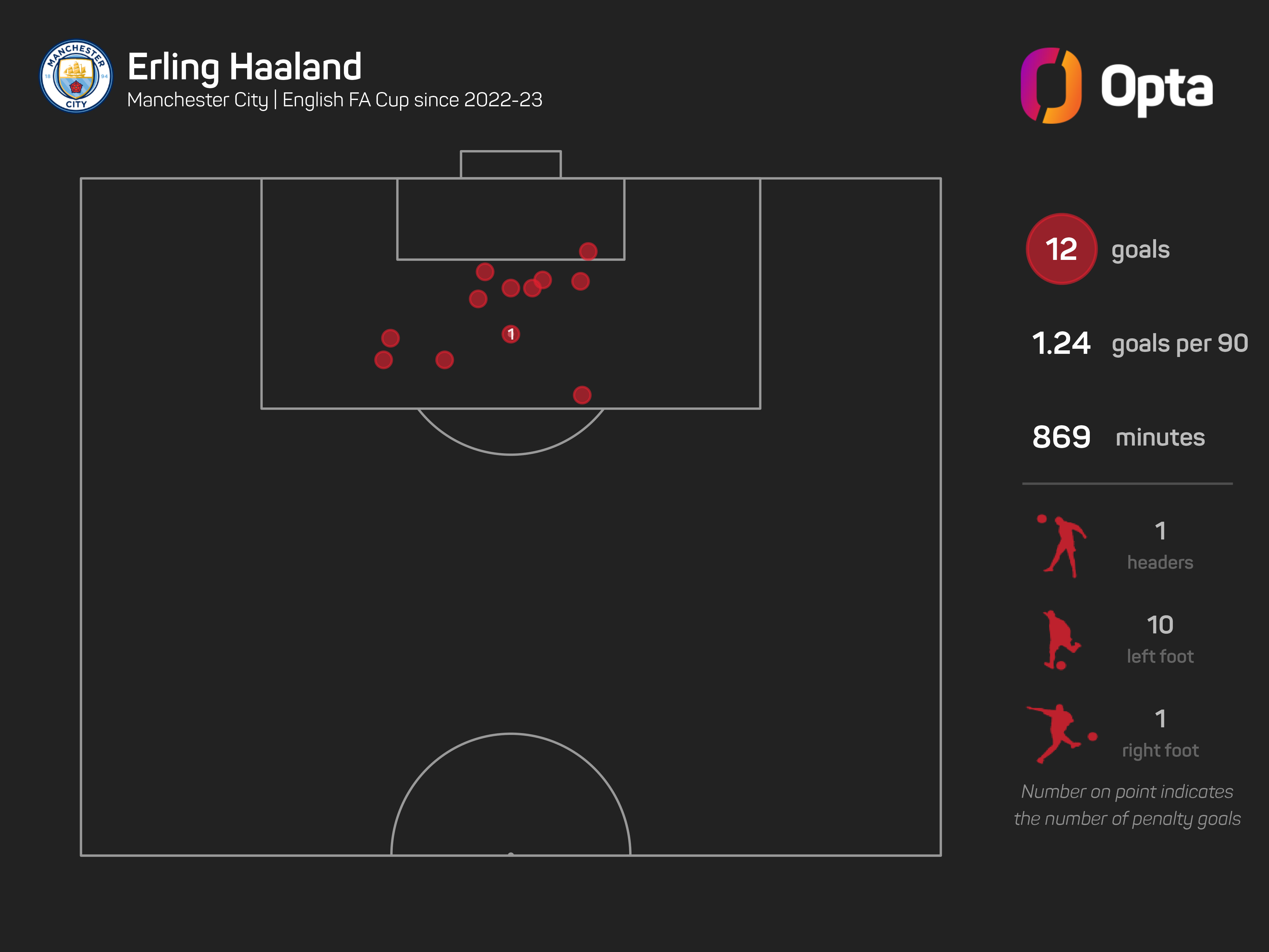 Haaland has scored 12 goals in 12 FA Cup appearances for Man City, with 11 of those 12 goals coming as part of hat-tricks (three vs Burnley in 2023, five vs Luton Town in 2024, three vs Liverpool in 2026).