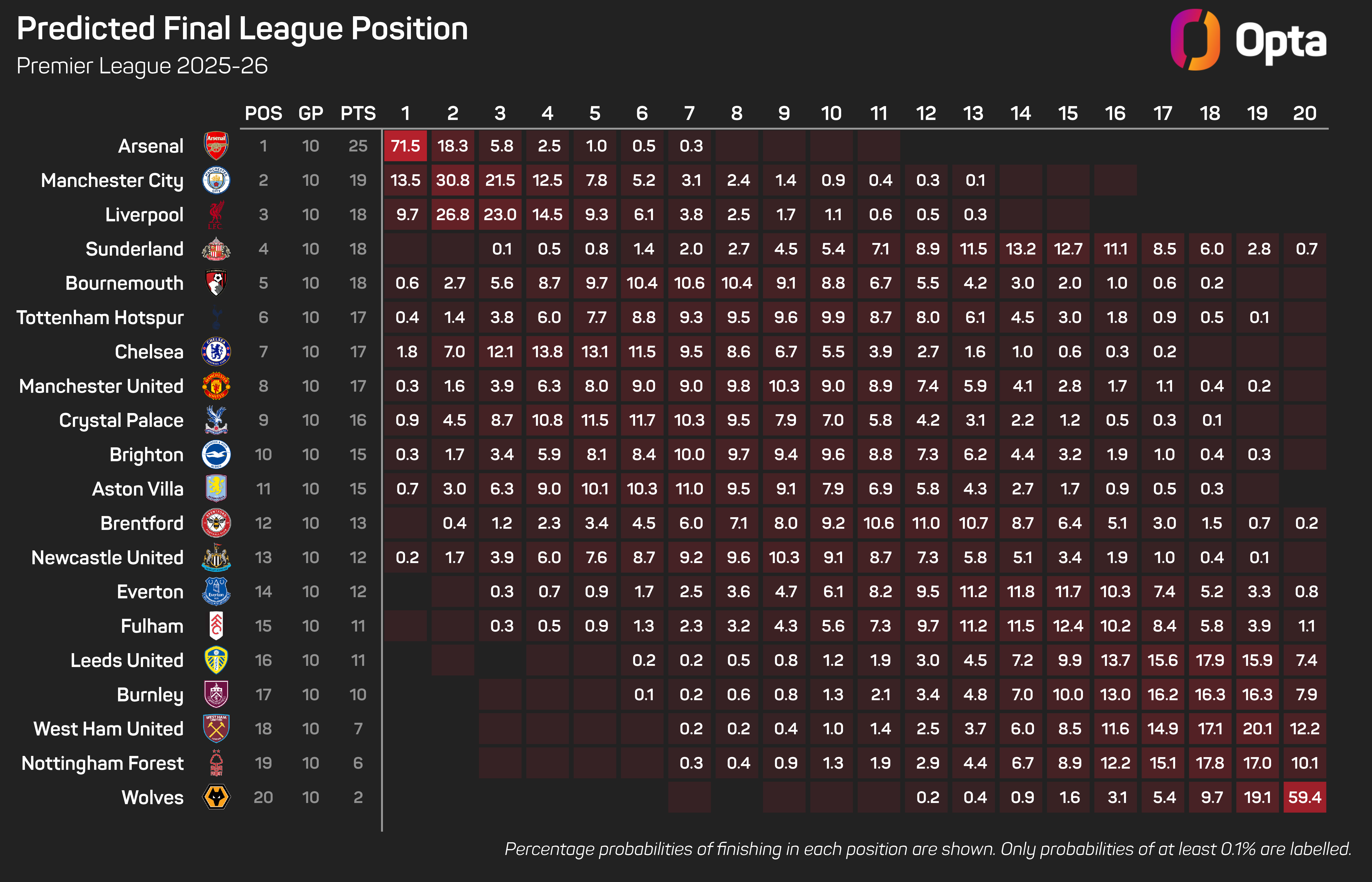 But it is Arsenal that are huge favourites to claim the crown, doing so in 71.5% of season simulations. City top the pile in 13.5% and Liverpool do so in 9.7%.