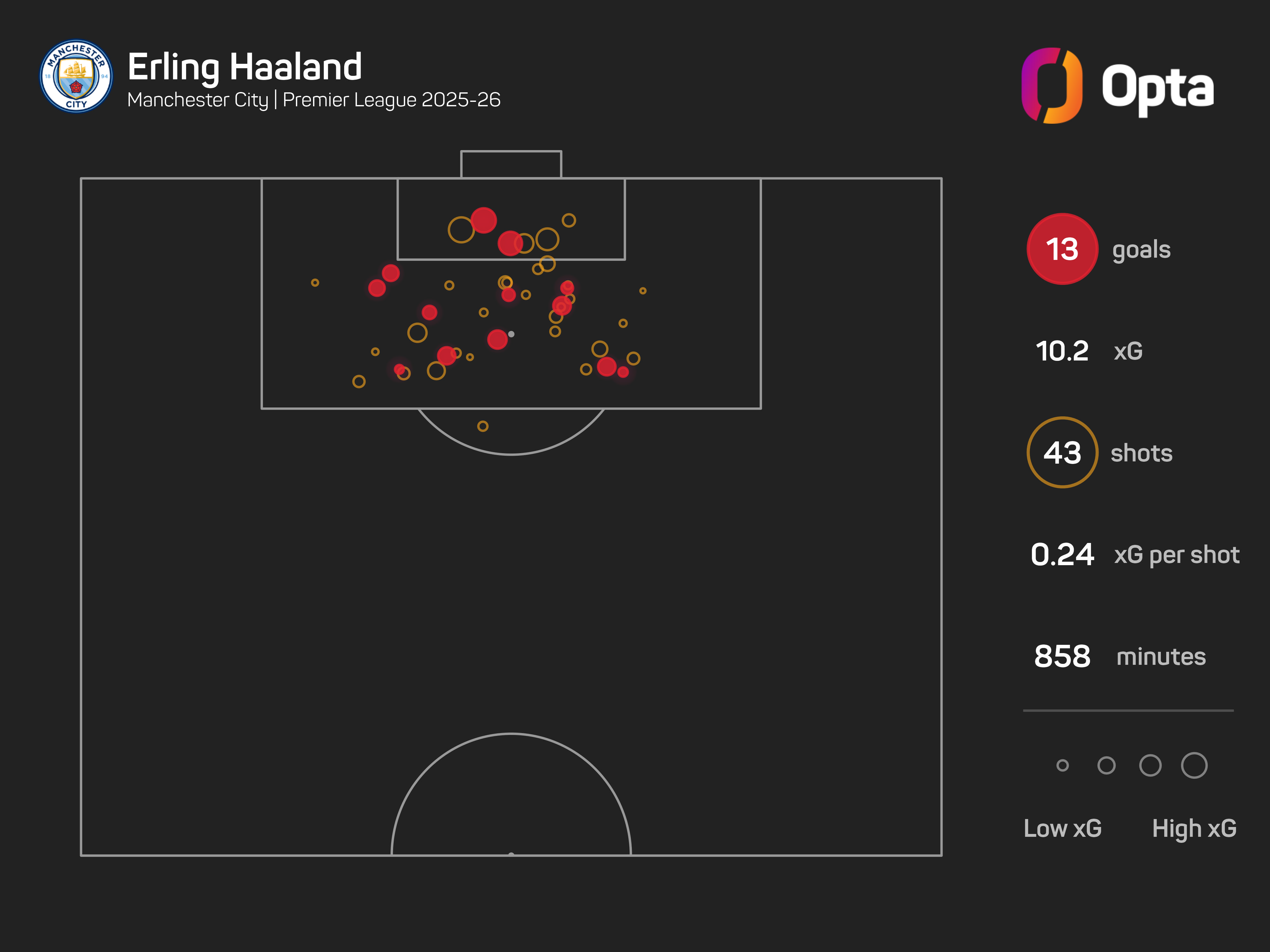 Haaland leads all players for goals (13), expected goals (10.25 xG), shots (43) and shots on target (25) in the 2025-26 competition.