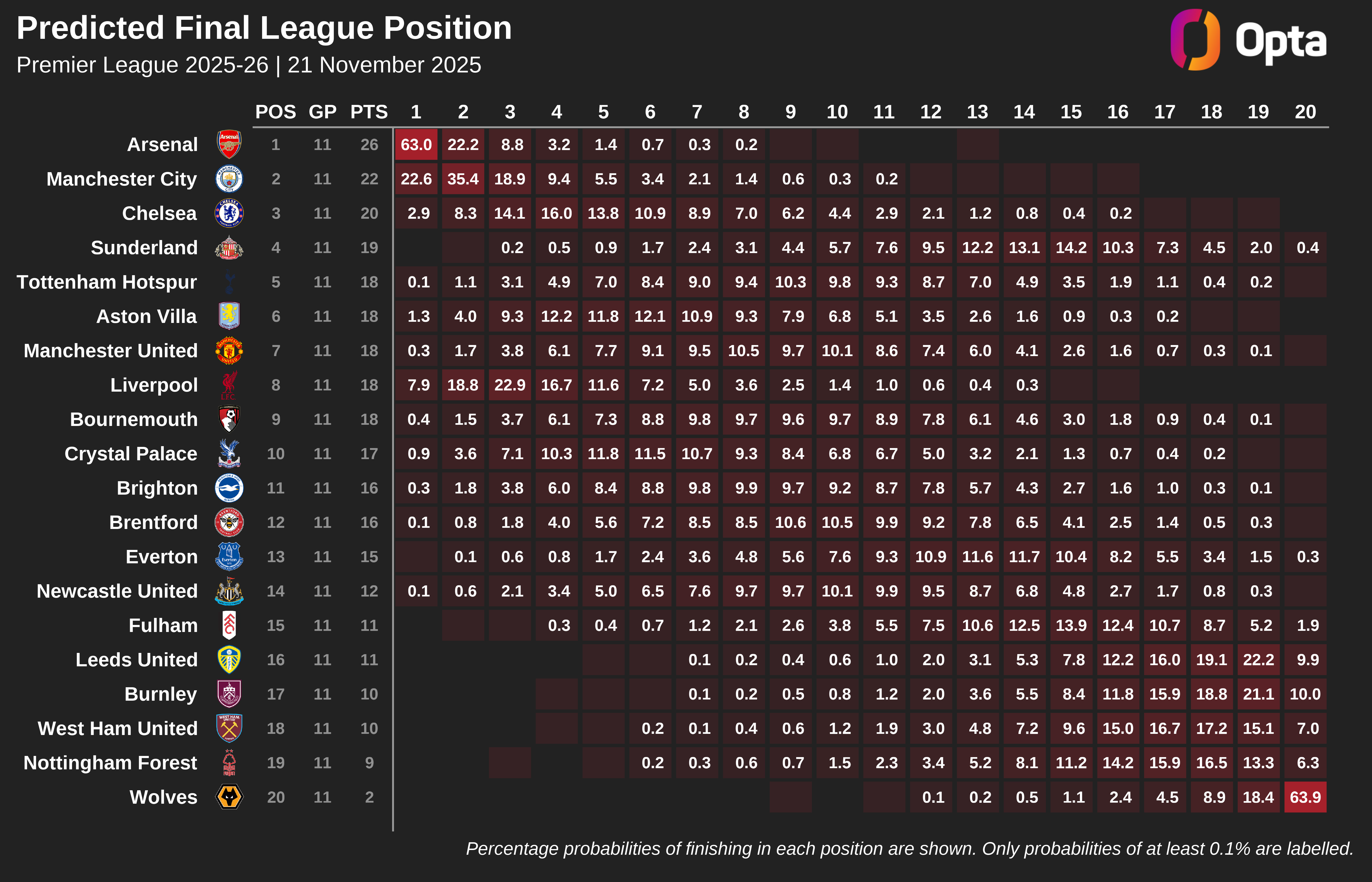 According to the supercomputer's 2025-26 season predictions, Arsenal's hopes of clinching the title dropped to 64.2% following their draw with Sunderland, but they are still significantly higher than those of second-placed Manchester City, at 22.4%.