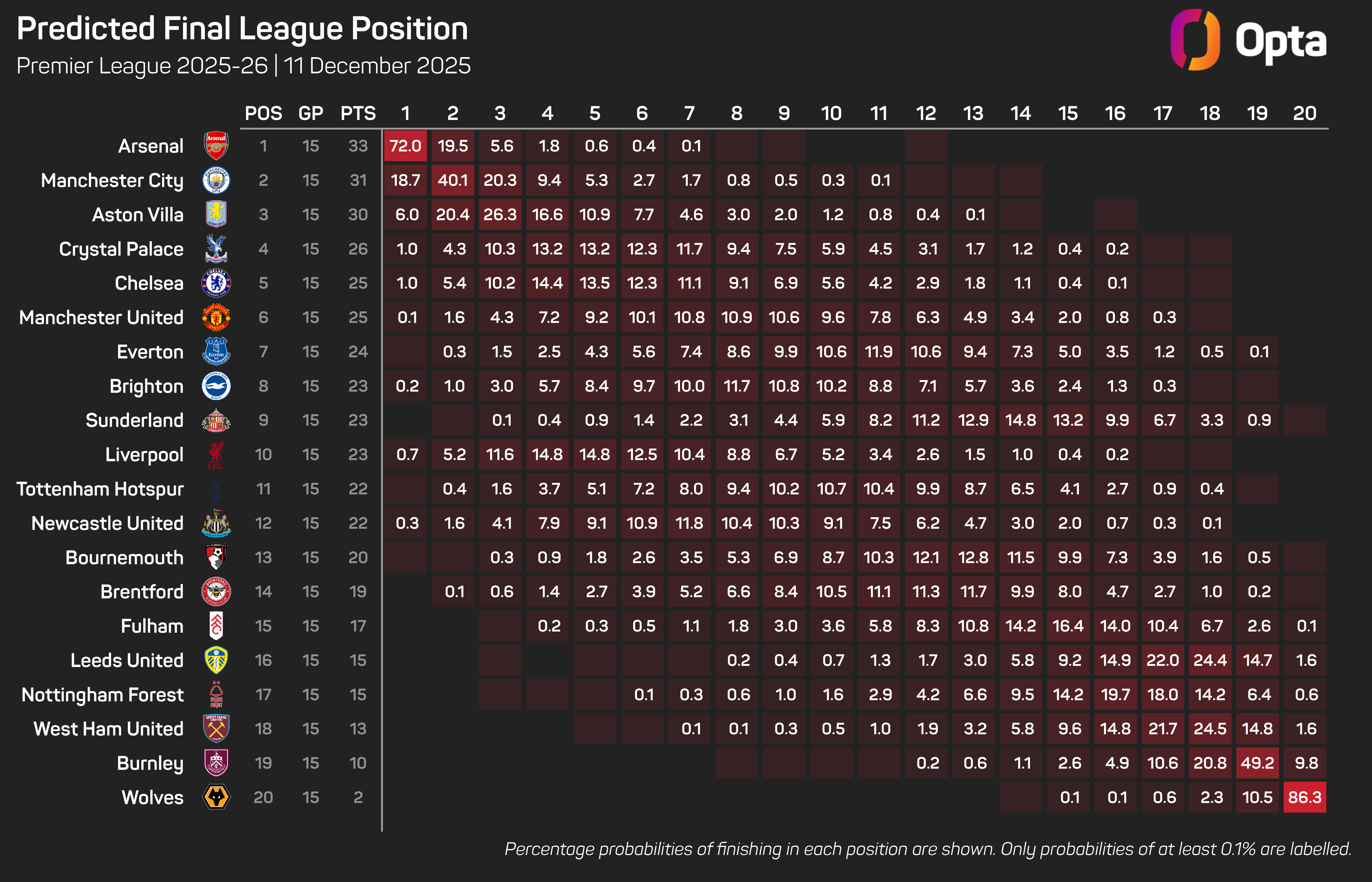 Unsurprisingly, then, Opta's supercomputer makes Arsenal the big favourites, handing them a win probability of 85.4%.