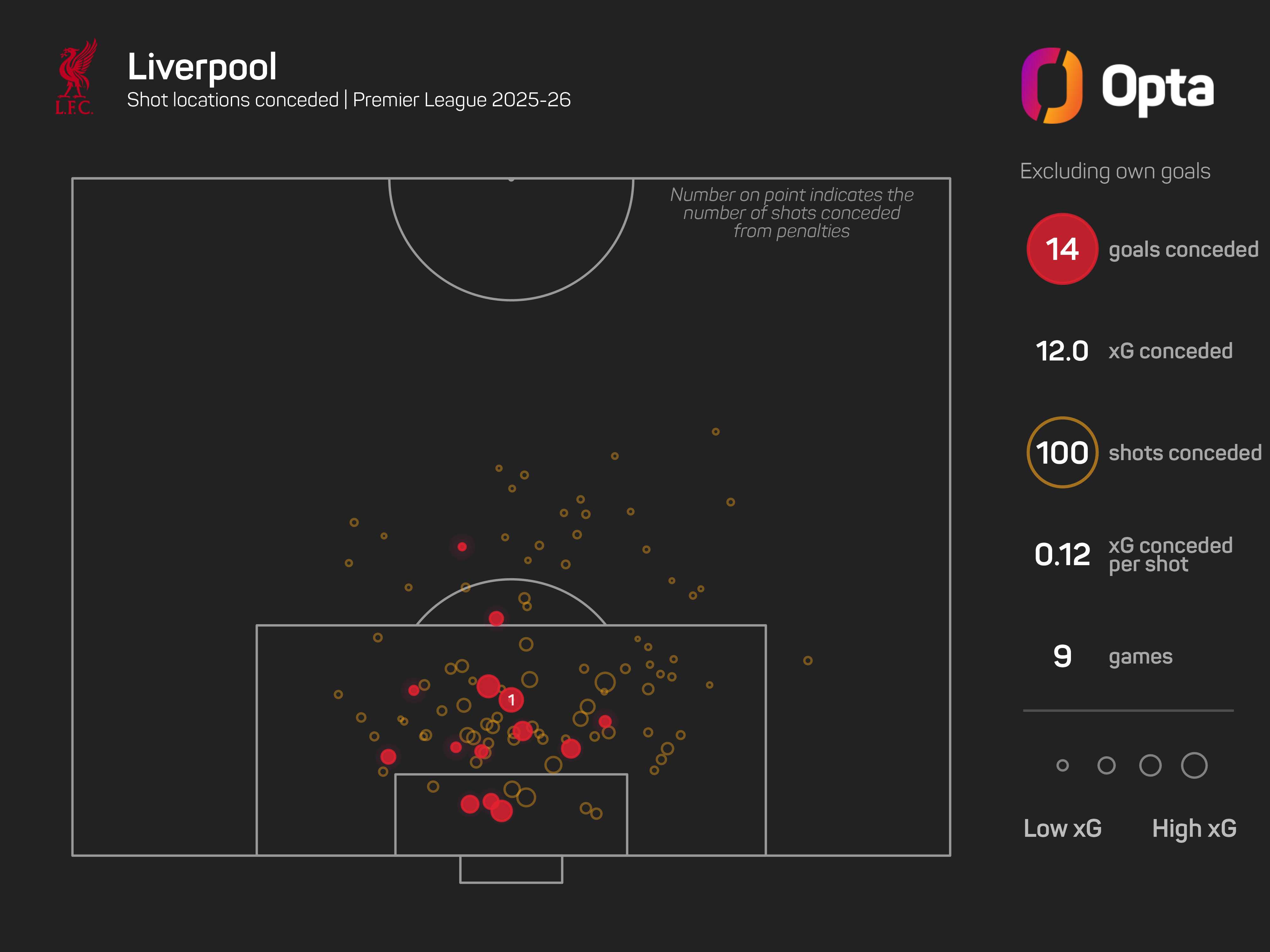 They have shipped 14 league goals, which is 11 more than would-be title rivals Arsenal (three) and seven more than Man City (seven), while they have already faced 100 shots in the top tier, for an overall expected goals against (xGA) figure of 12.