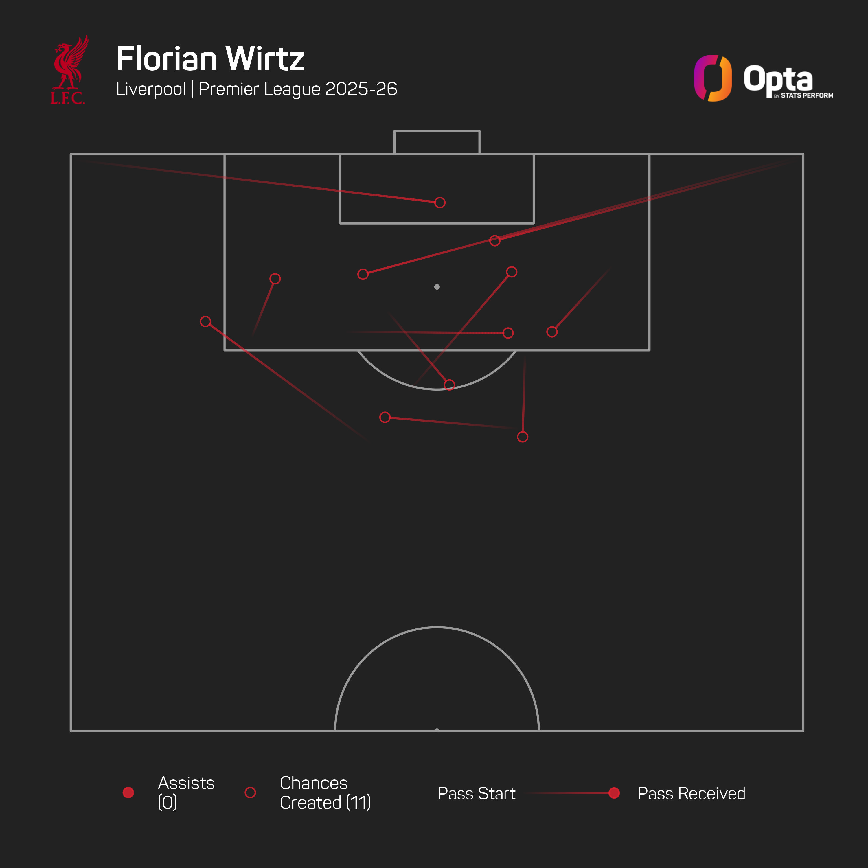 Then there is Florian Wirtz, who is yet to register a goal or assist in the Premier League despite having nine shots and creating 11 chances – his 20 combined shots and chances created are the most of any player yet to score or assist in the competition this term.