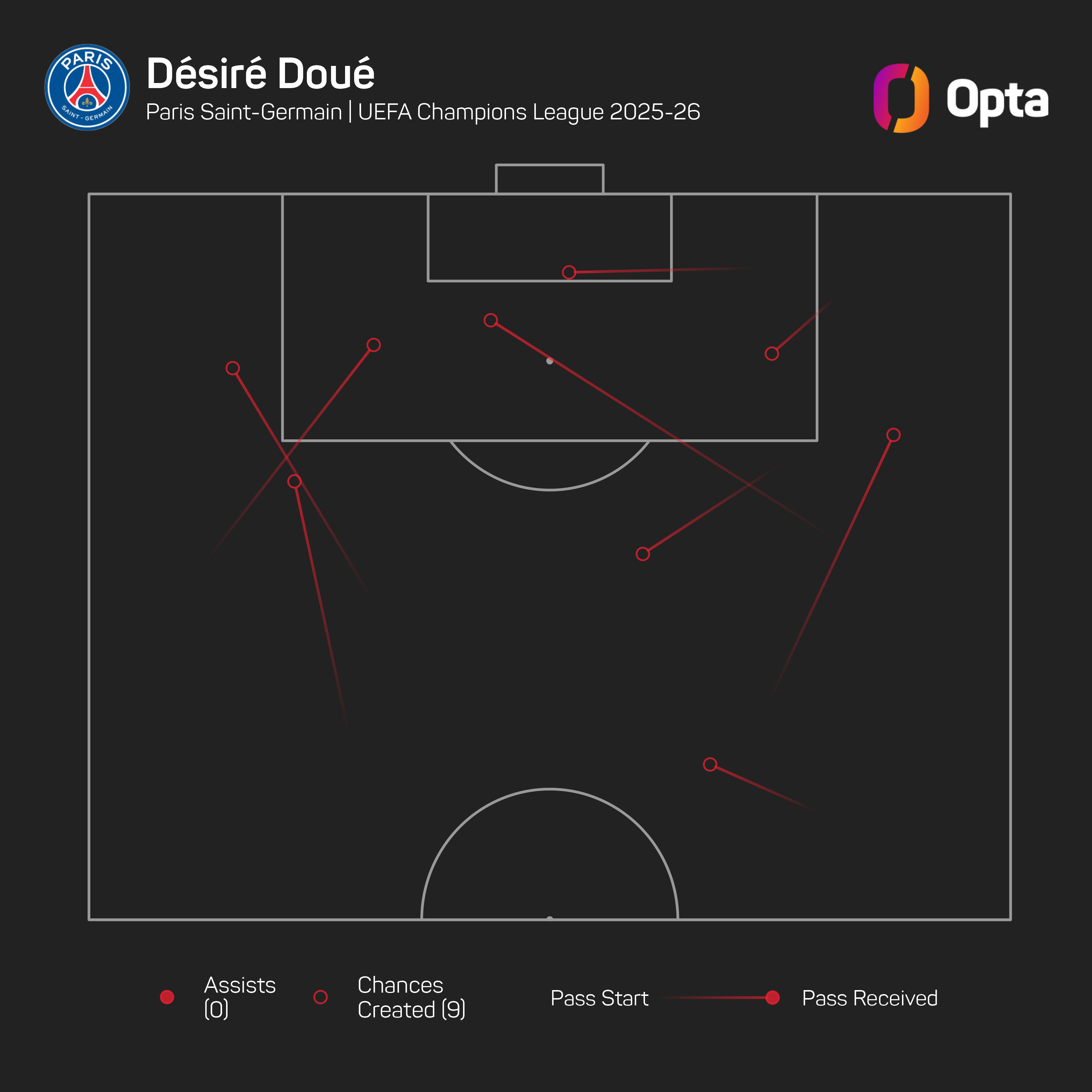 He is the second PSG player to do that this season (Lee Kang-in vs Bayern Munich), with only two PSG players creating 7+ chances in a match between 2004-05 and 2024-25 on record previously.