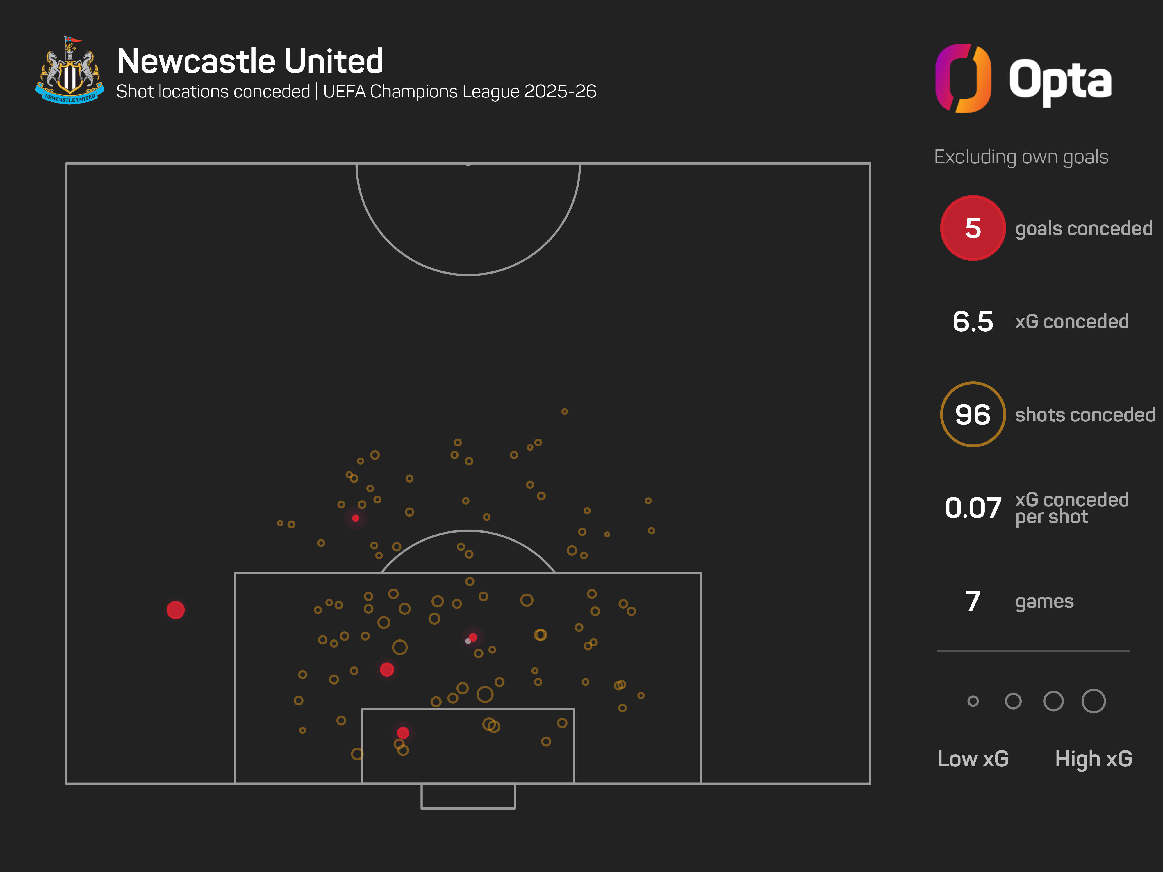 Only Arsenal (5.0) and Liverpool (6.2), meanwhile, can boast a lower xG against figure than Newcastle's impressive 6.4, and Howe's back line will have to be at its best to keep out a team that has registered the most shots (148) and shots on target (54) in the Champions League this term.