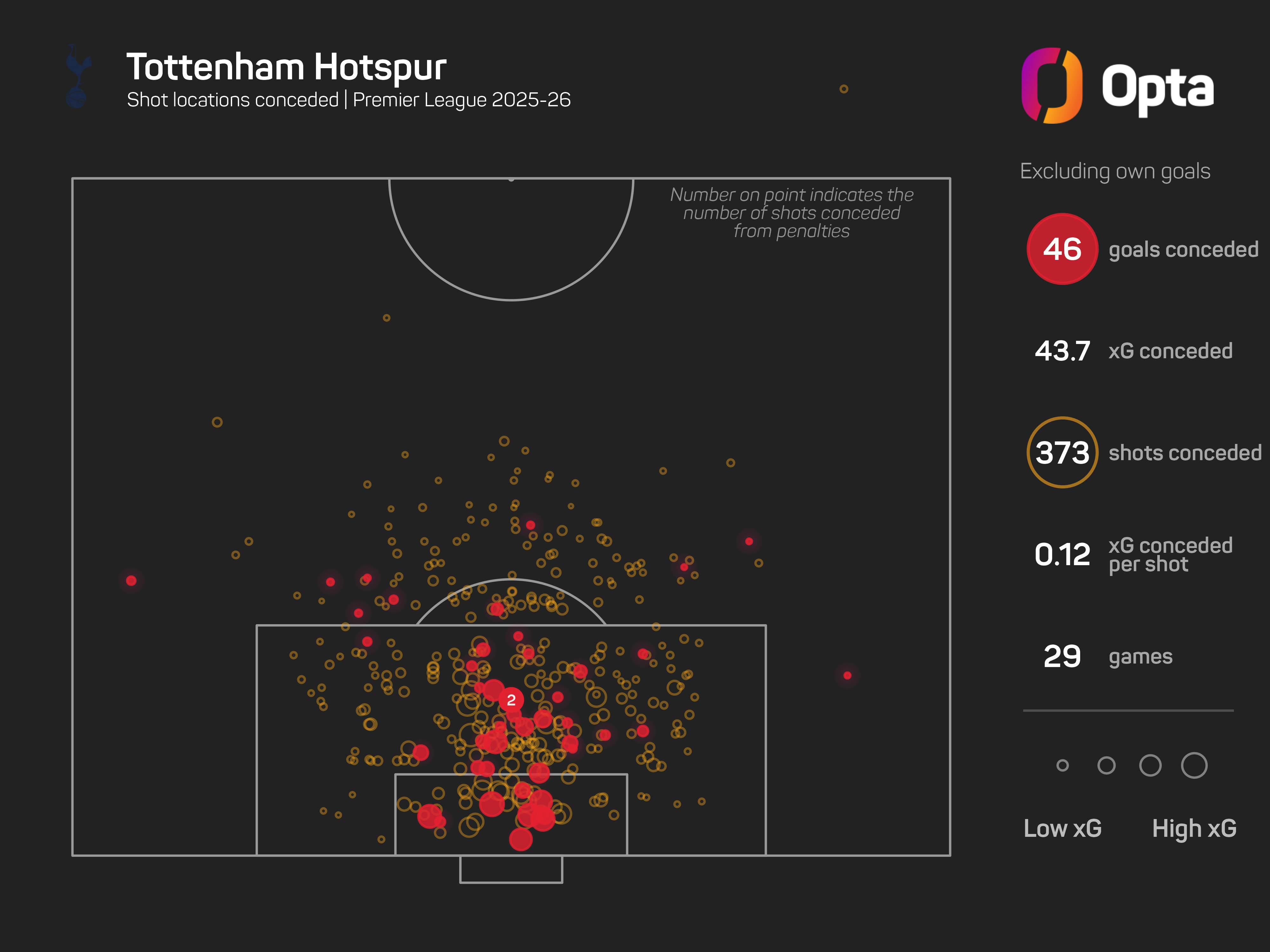 Spurs have shipped 111 goals, trailing just West Ham (116) and Wolves (121), while their 108.0 xG against in that time is the worst in the division.