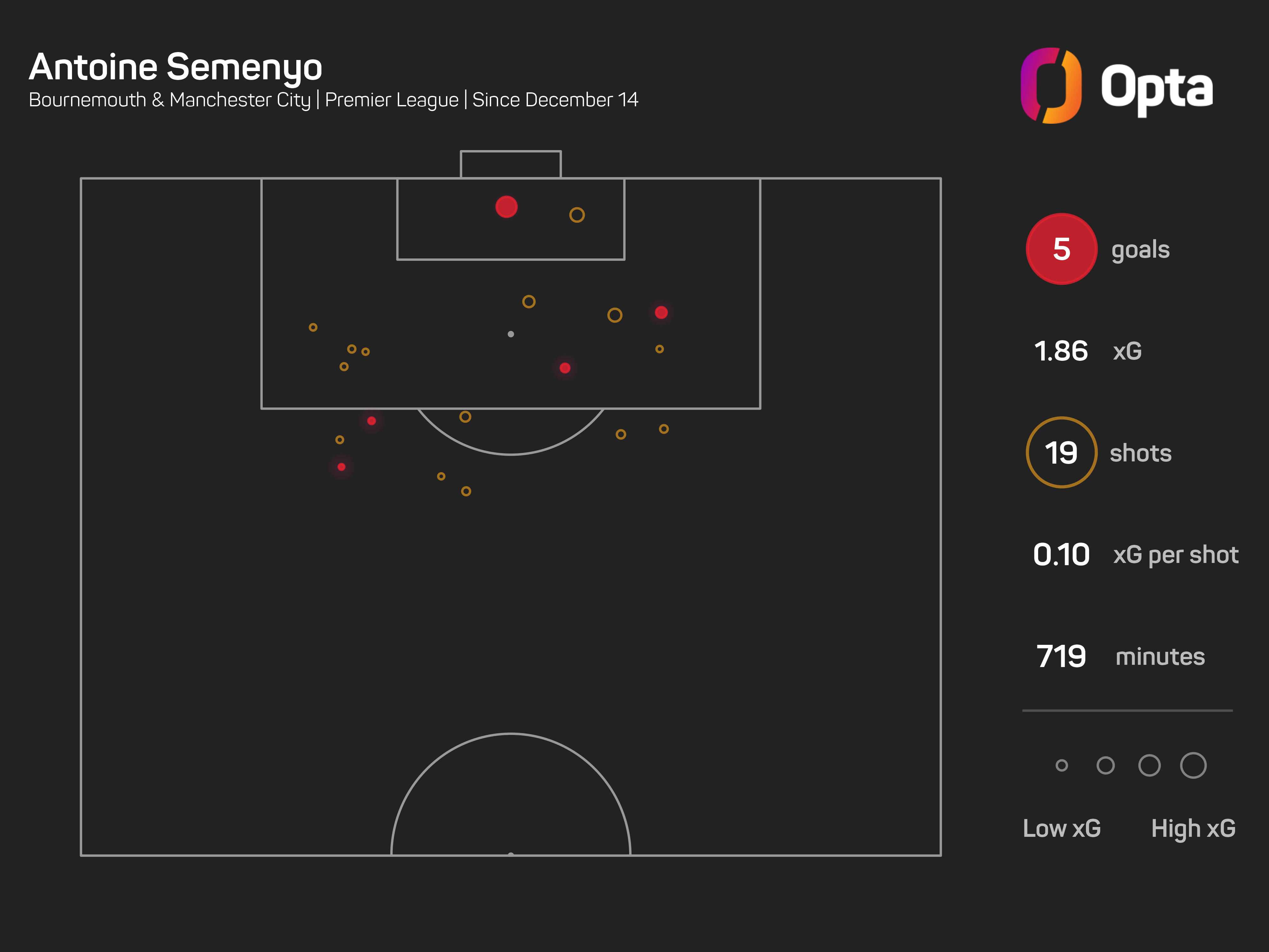 Semenyo has scored five goals in his last eight Premier League appearances for both Bournemouth and City, the joint-most of any player in the division since December 15.