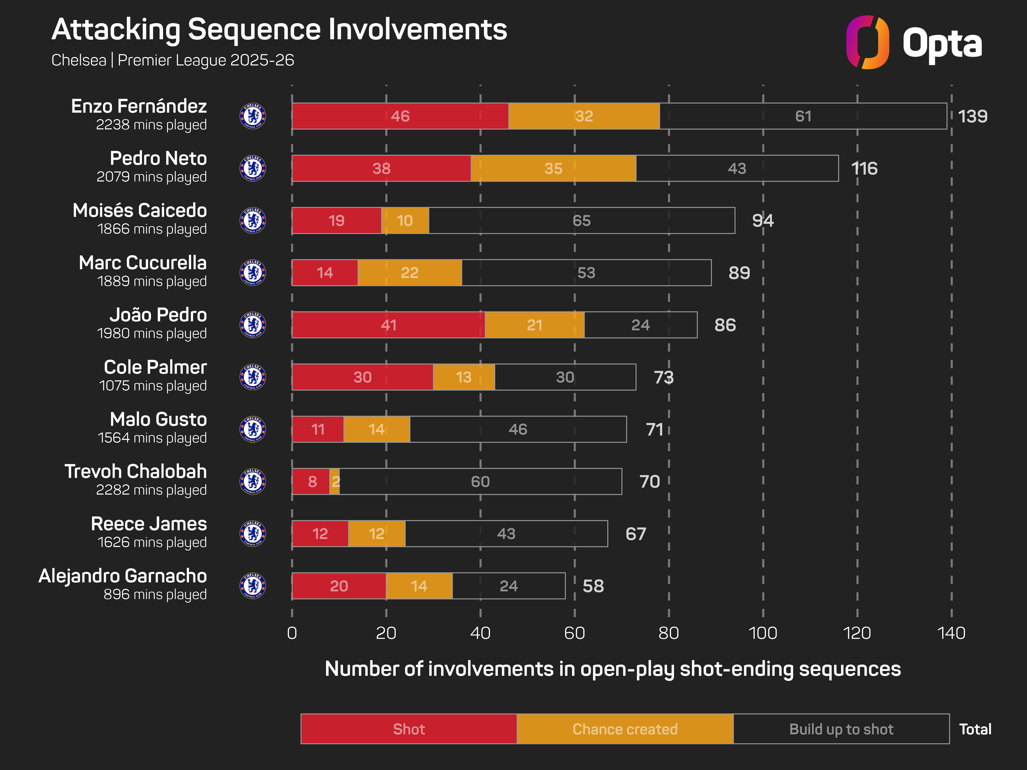 Despite playing only 1,075 minutes in the league this term, Palmer has registered 73 involvements in open-play shot-ending sequences, which ranks sixth in Chelsea's squad.