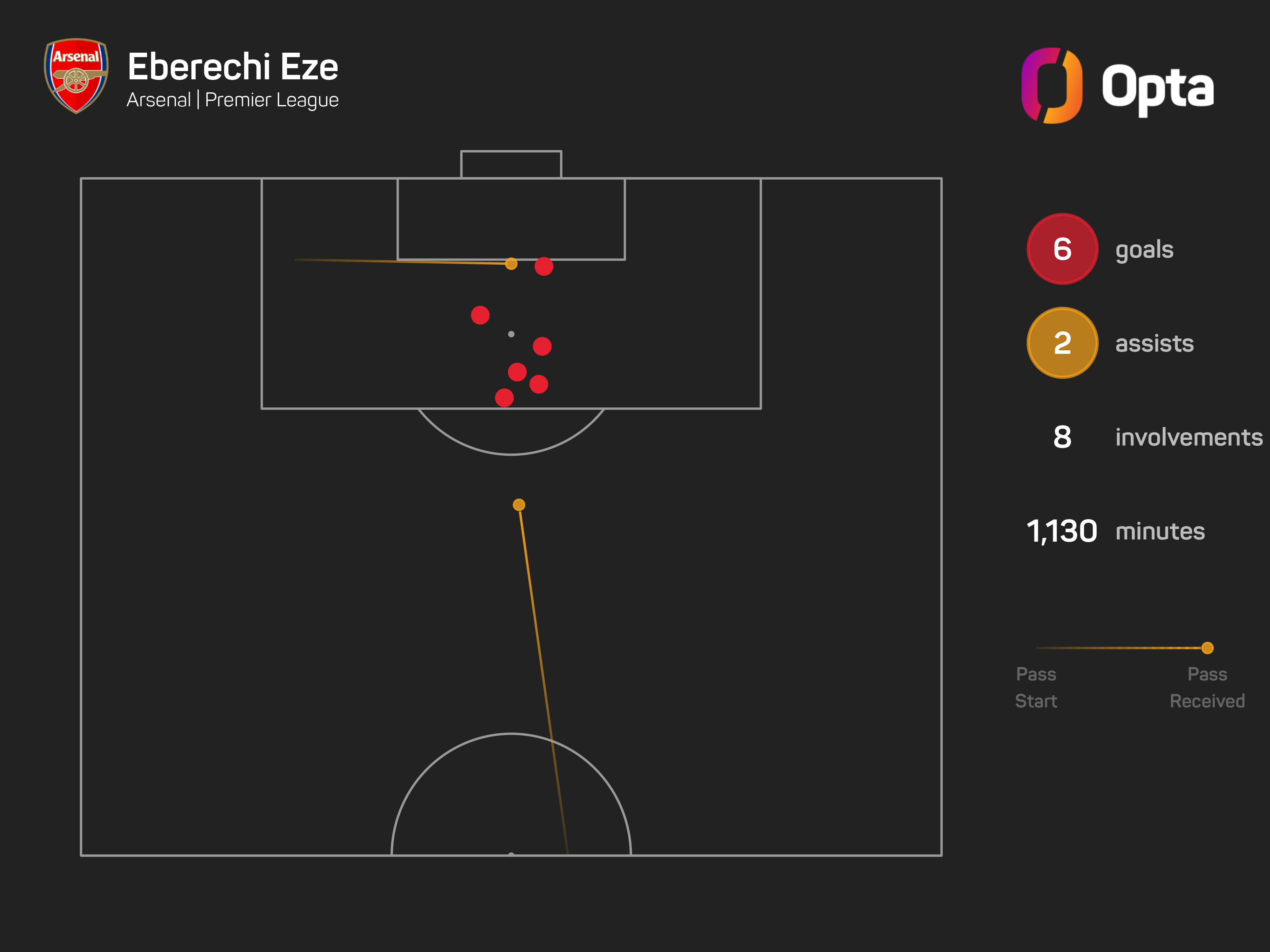 Eze has scored each of his last 11 Premier League goals in London, with all six of his goals for Arsenal this season coming in London derbies (one vs Palace, five vs Spurs), the most ever by a player in a season without scoring outside of derby games.