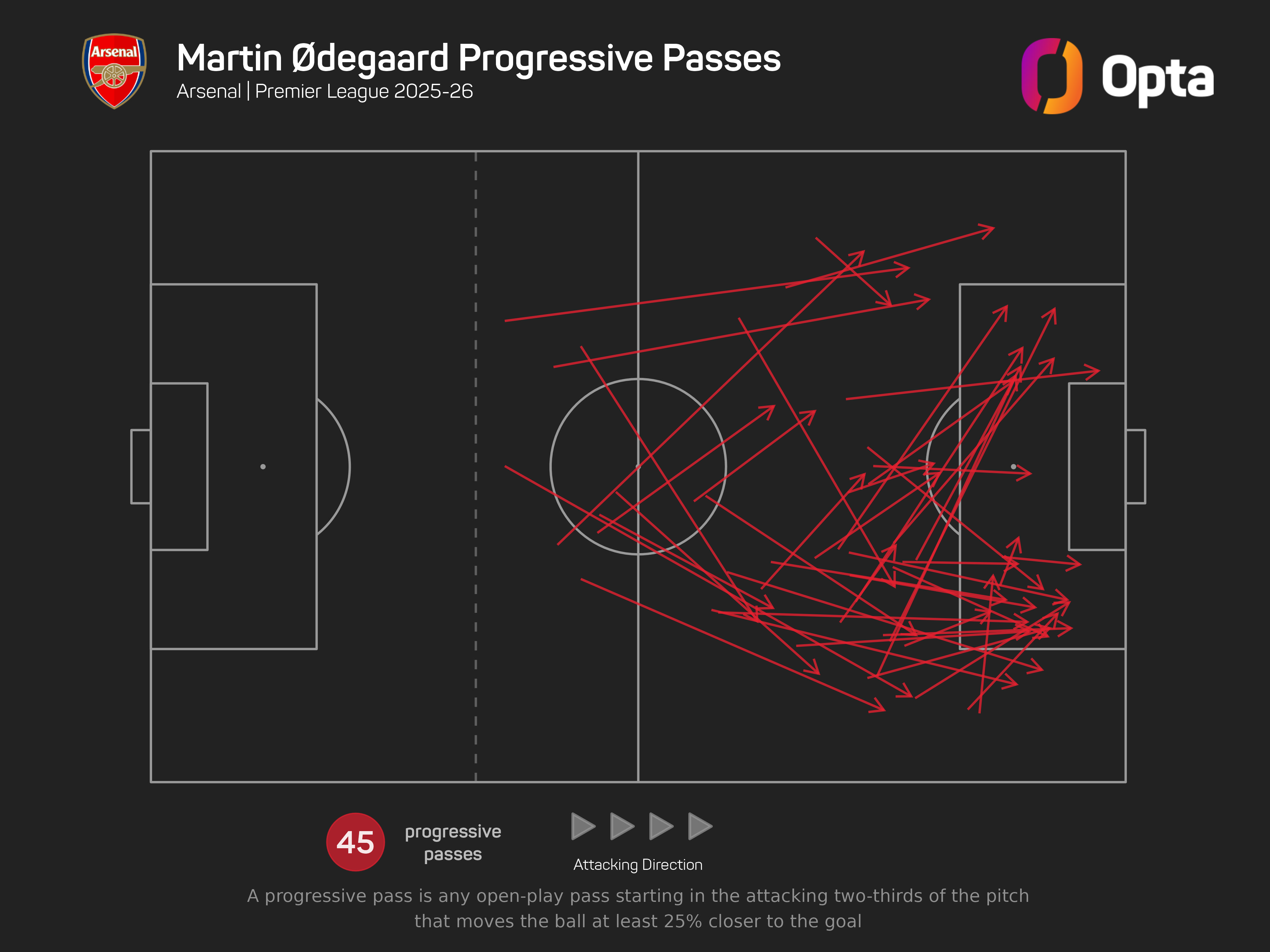 The Norway international has had injury problems of his own this season, only playing 42% of Arsenal's total Premier League minutes (718 of a possible 1,710), but he has still played more line-breaking passes into the penalty area than any other Arsenal player (16).