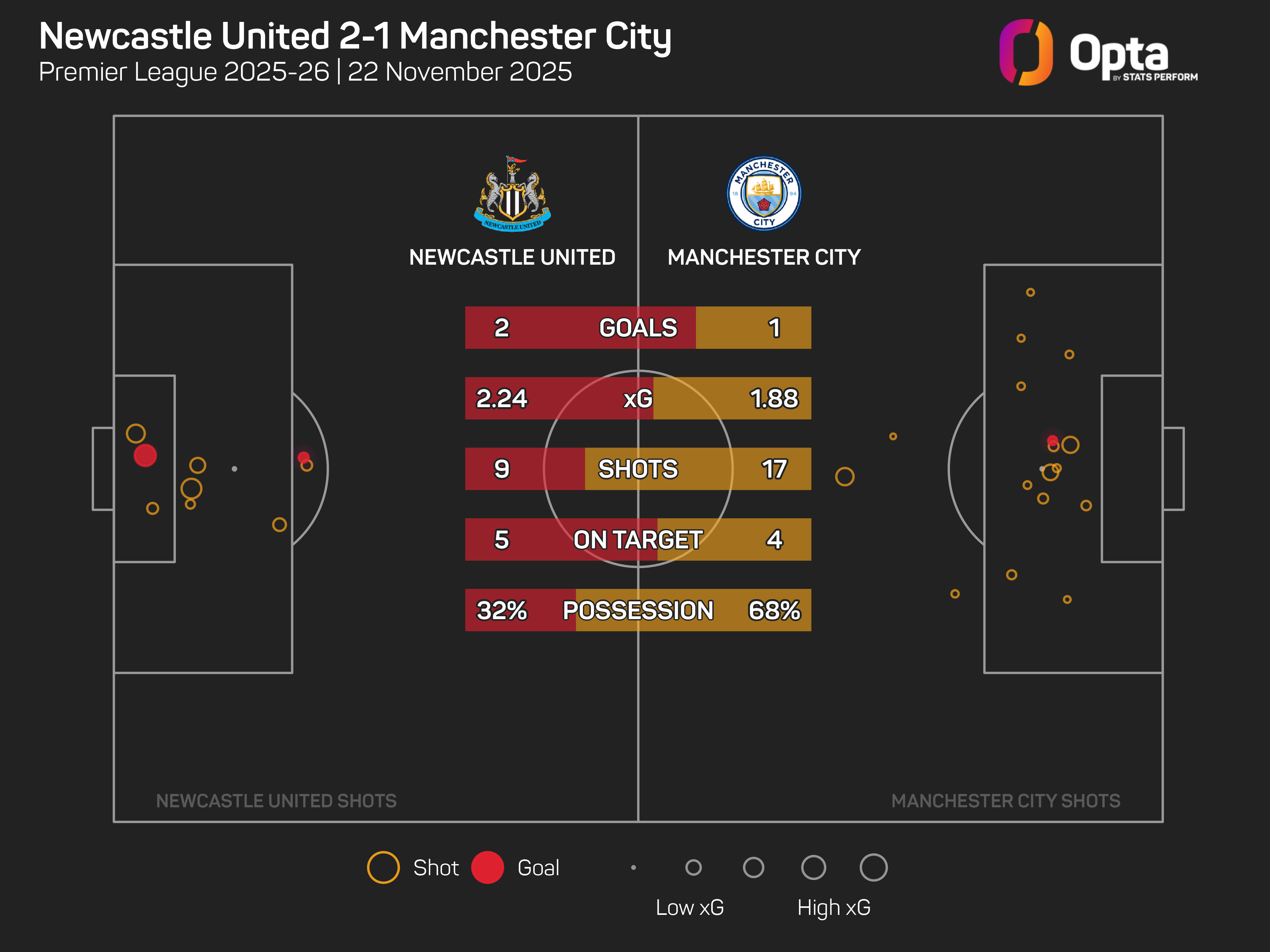 The first half of Saturday's game featured seven big chances, as defined by Opta, with four falling to Newcastle and three to City, while the teams combined for a total of 2.59 expected goals (xG) before the break (1.18 for Newcastle, 1.41 for City).