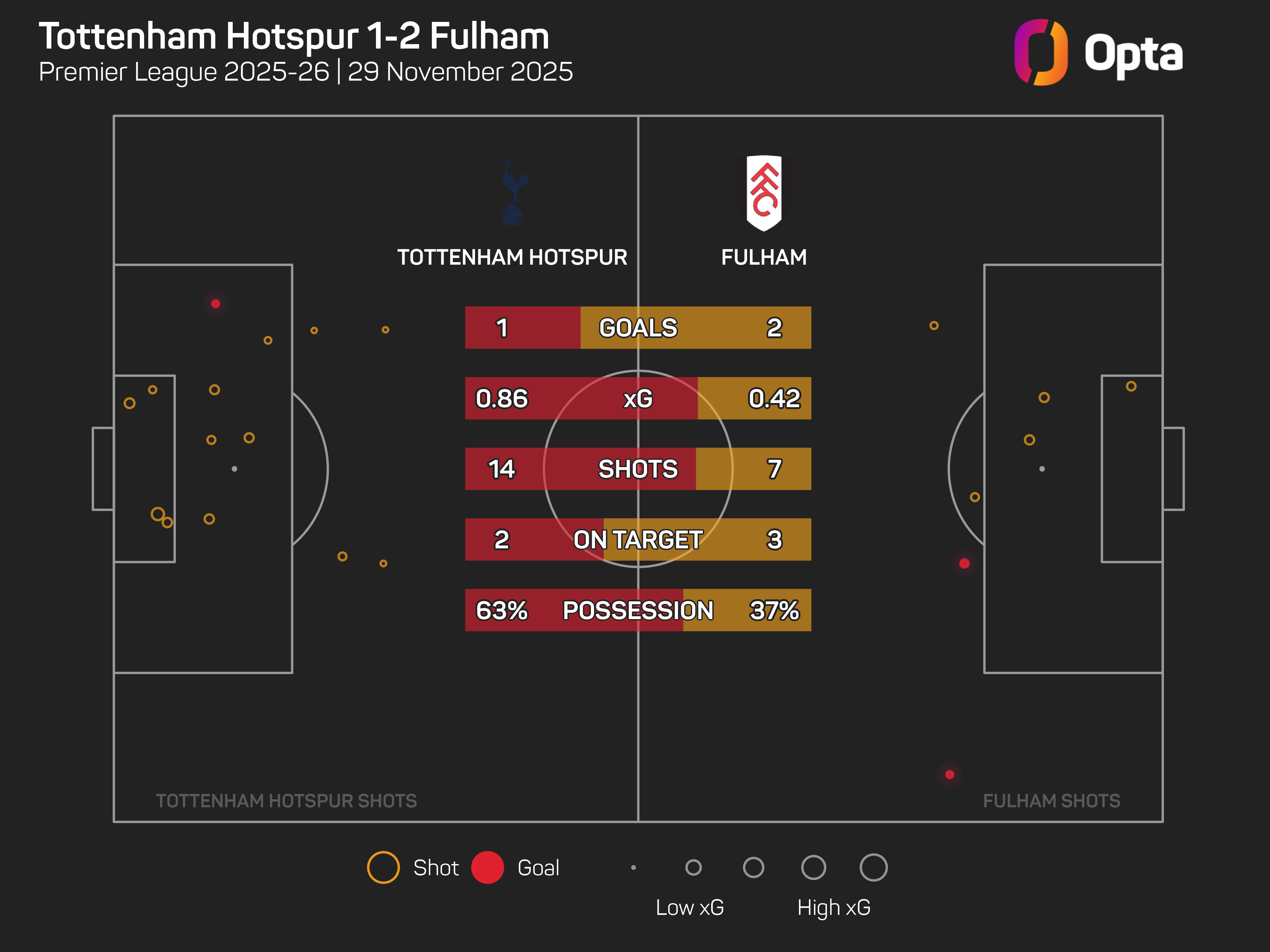 An improved second half saw them win the xG battle, but with a mere 0.86 (Fulham had 0.42). Only Burnley (7.0) have amassed fewer xG at home in the Premier League this season than Spurs (8.0).