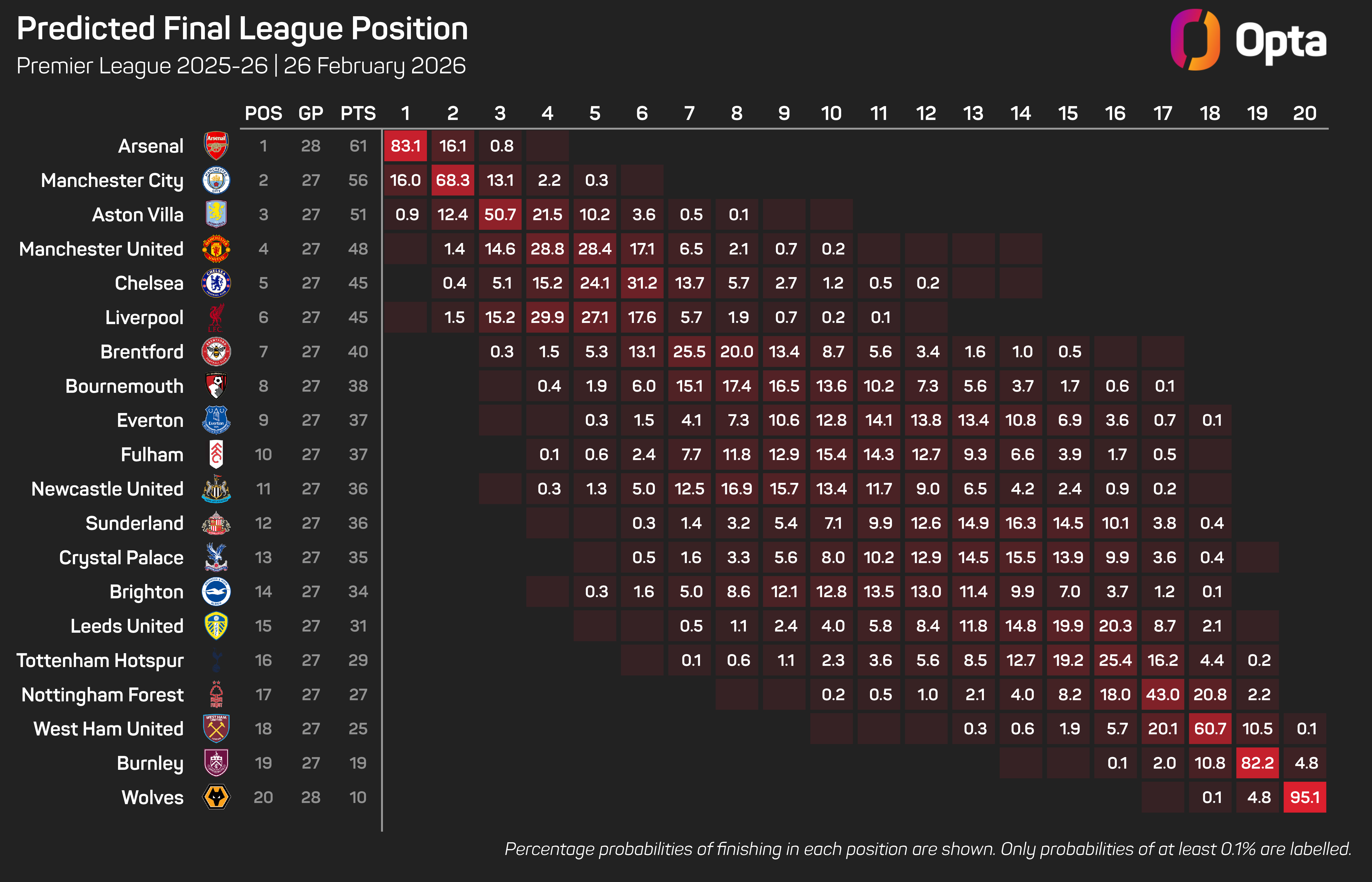 The Opta supercomputer is only giving Spurs a 4.6% chance of being relegated to the Championship.