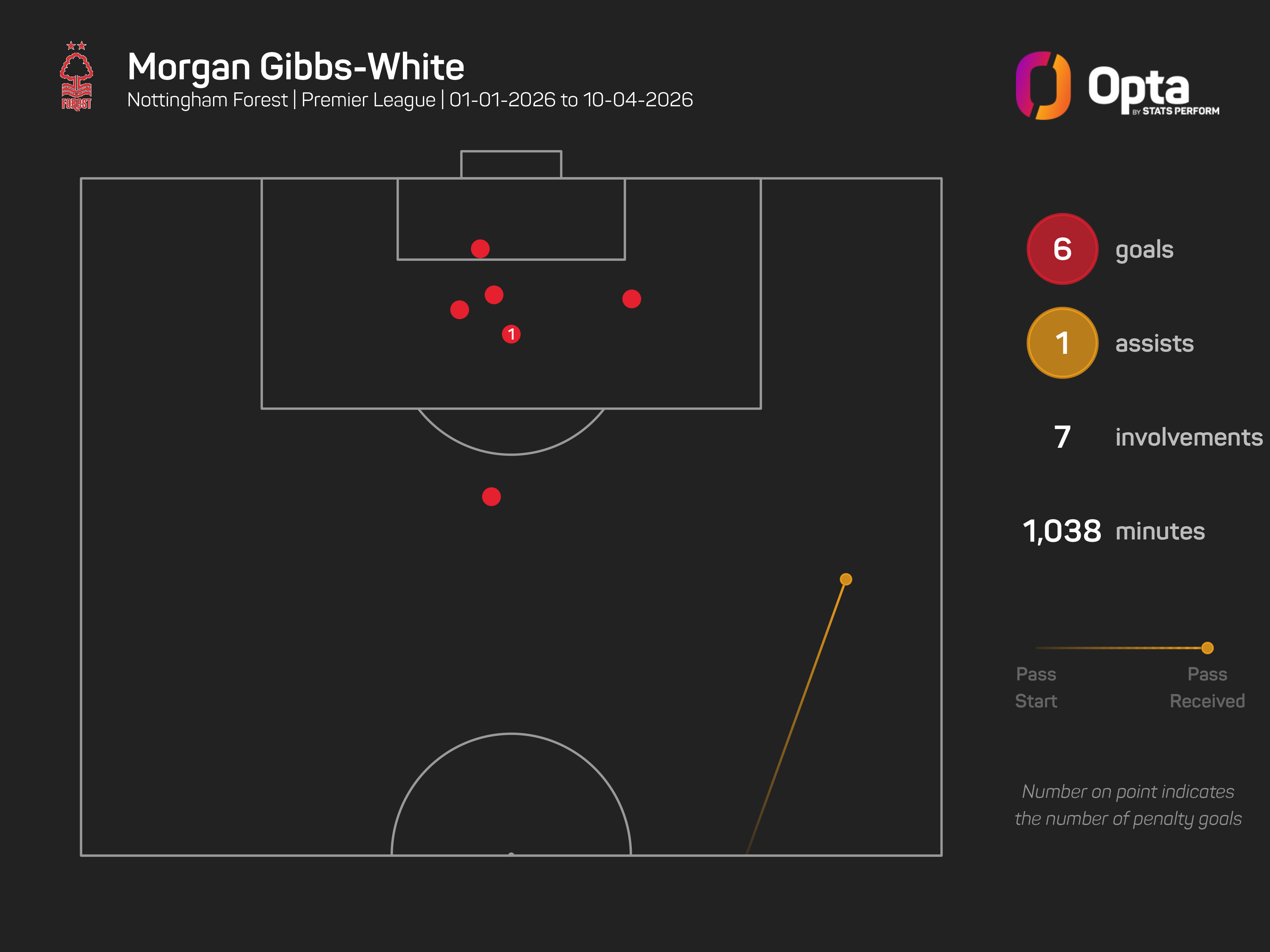 In 2026, only Bruno Fernandes (12), Joao Pedro (10), and Igor Thiago (eight) have more Premier League goal involvements than Gibbs-White (seven – six goals, one assist).