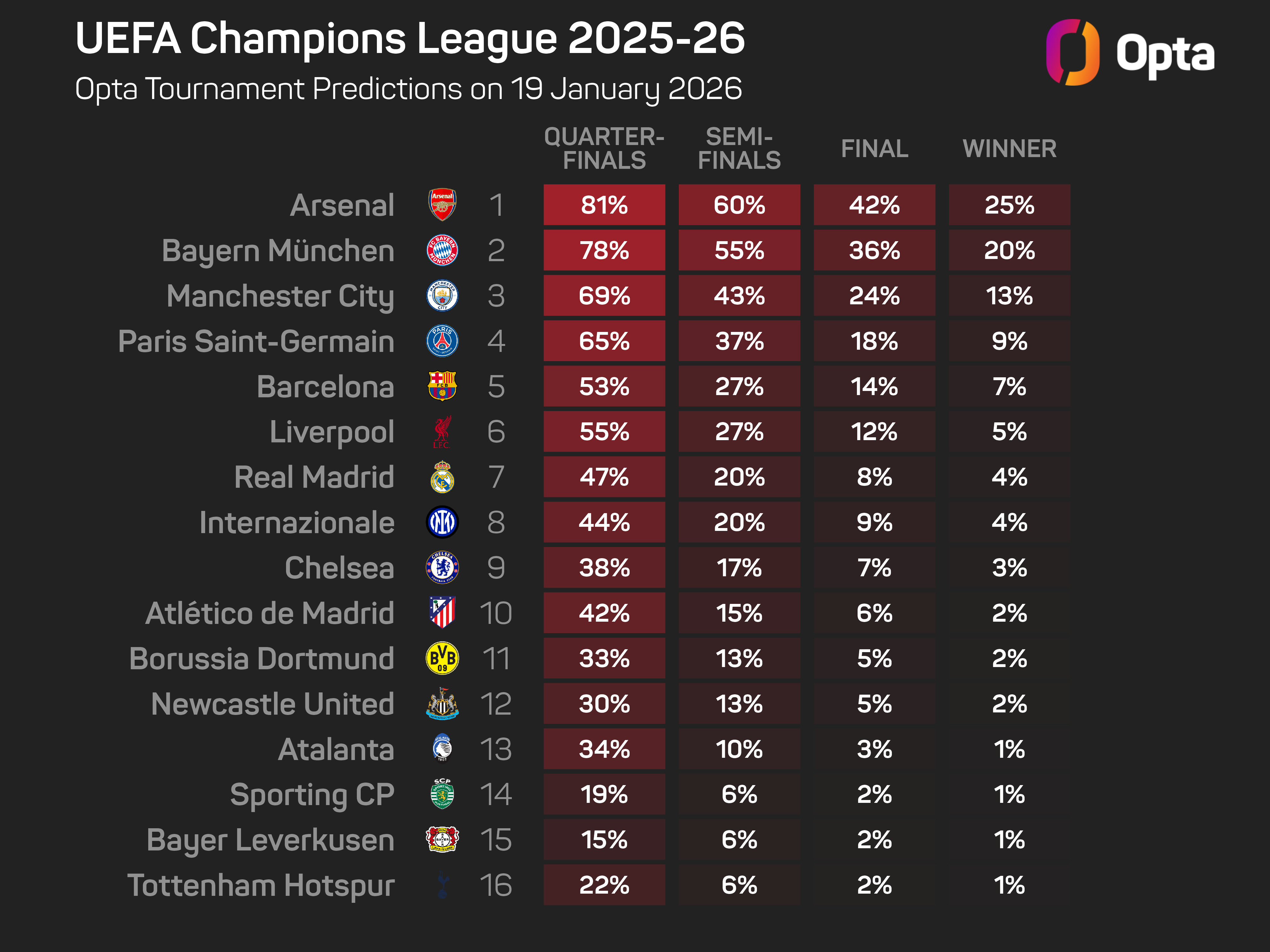 Arsenal are still fighting for silverware on four fronts, sitting top of the Premier League and Champions League standings, with the Opta supercomputer making them heavy favourites in both.