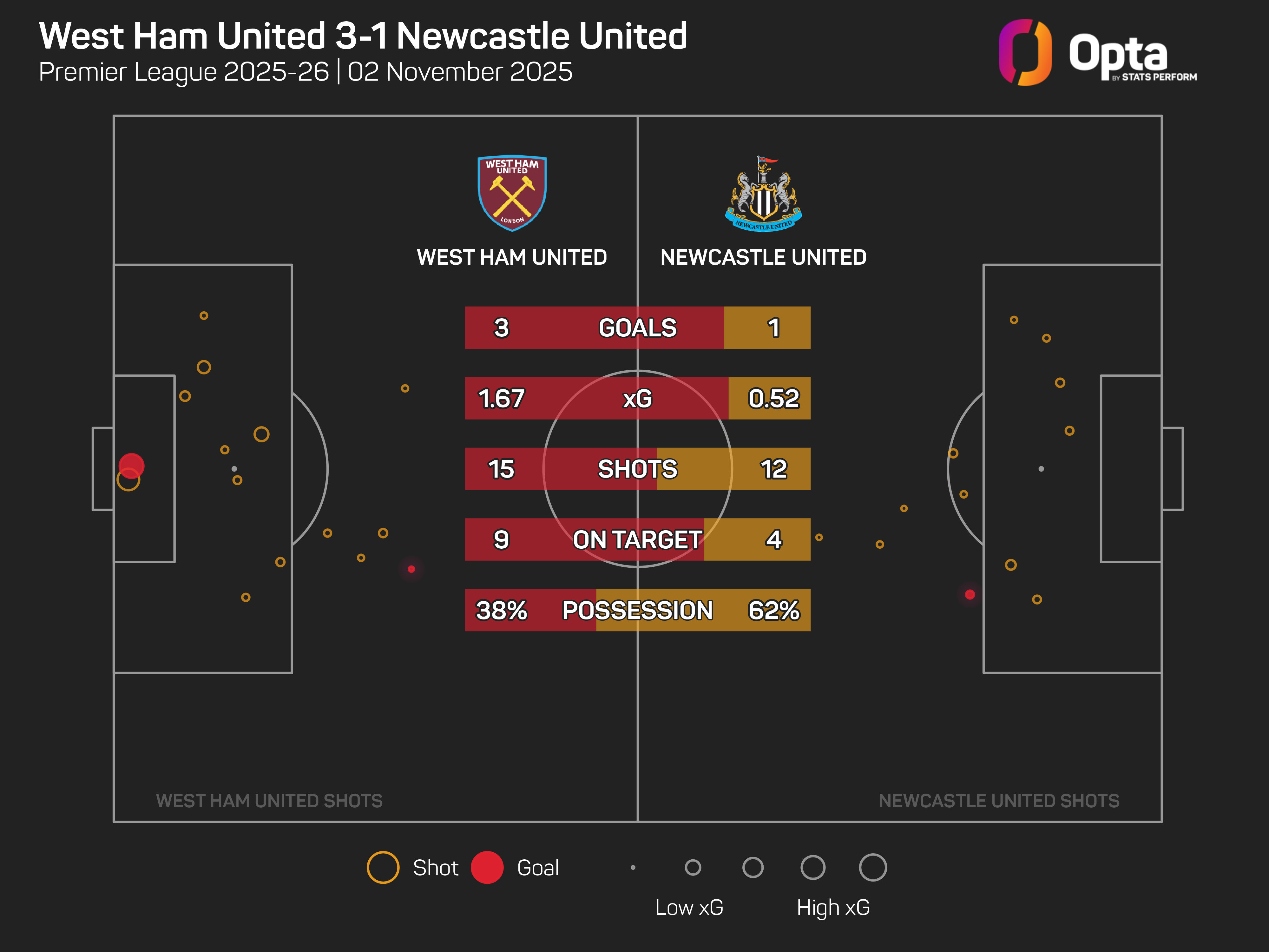 But they will have been pleased about how the Hammers performed, with Sunday's hosts registering an expected goals (xG) total of 1.67 from their 15 shots, nine of which were on target, compared to Newcastle's 0.54 from their 12 attempts.