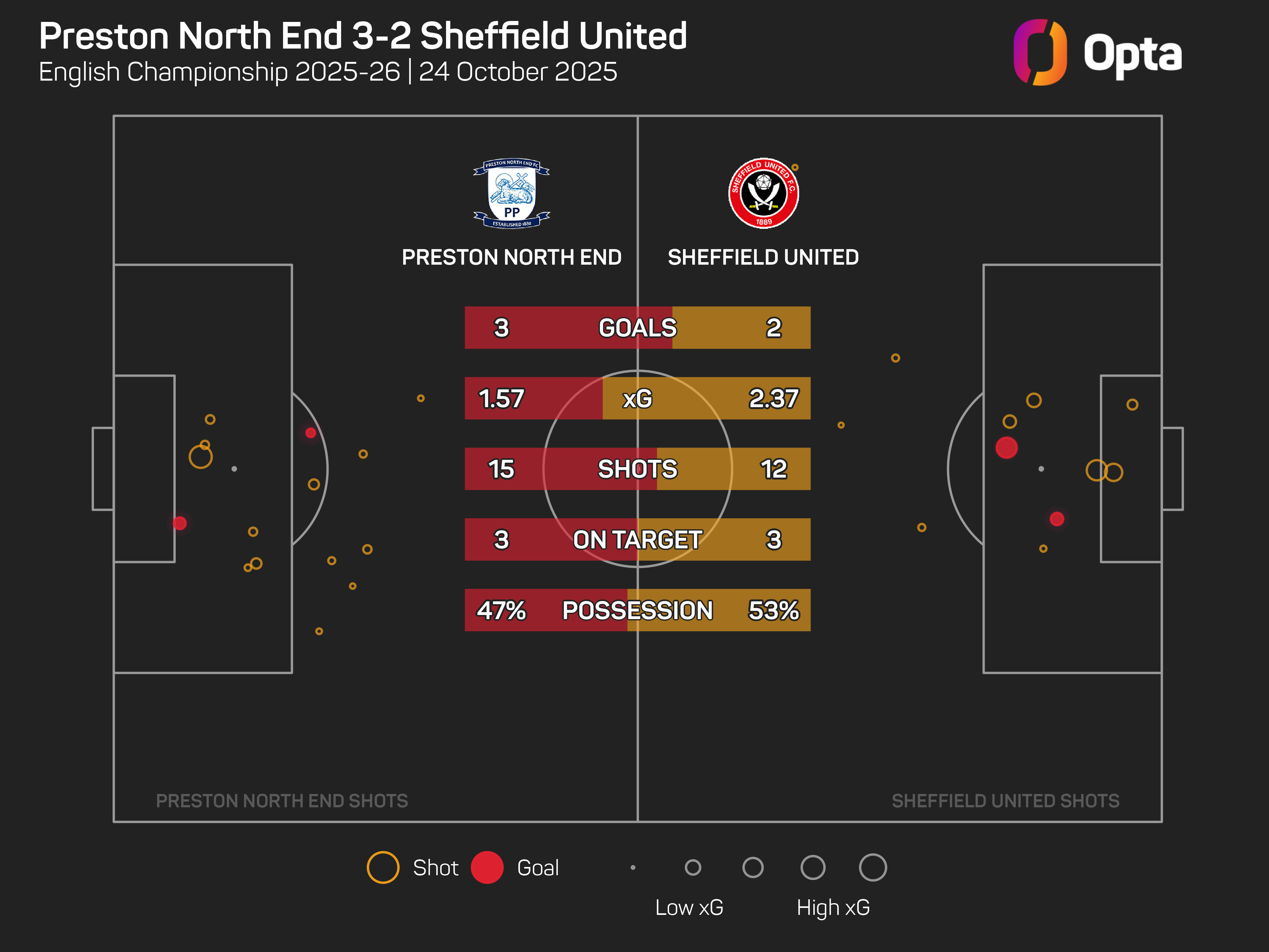 Frustratingly for Wilder, United finished with 2.4 expected goals (xG) from their 12 attempts, higher than Preston's 1.6; however, they scored with all three of their efforts on target (15 shots overall).