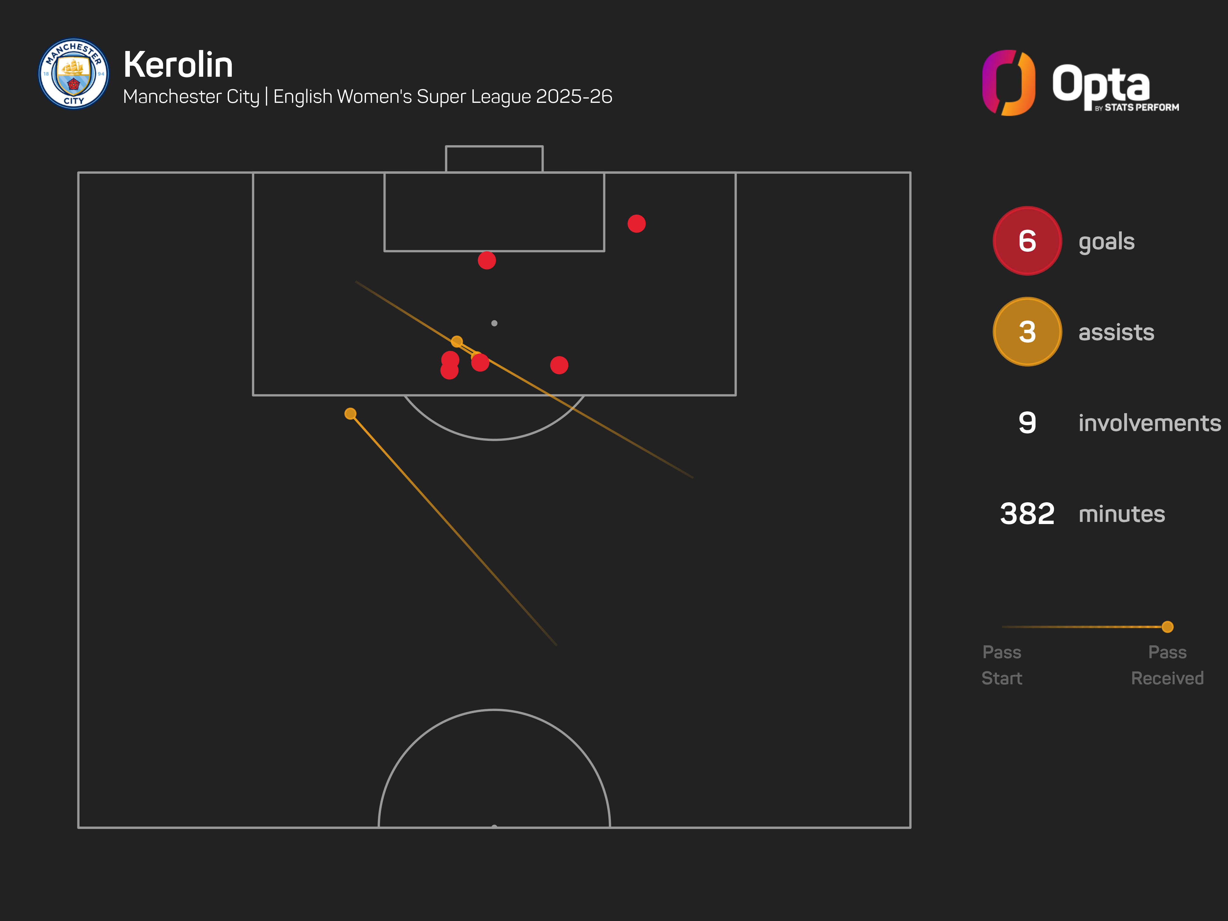 Indeed, Kerolin became the first player in WSL history to score a hat-trick against the reigning champions. She has scored (six) or assisted (three) in her last six league outings and is averaging a goal involvement every 42 minutes this term, the best rate of any player in a single campaign in the competition's history (minimum 300 minutes played).