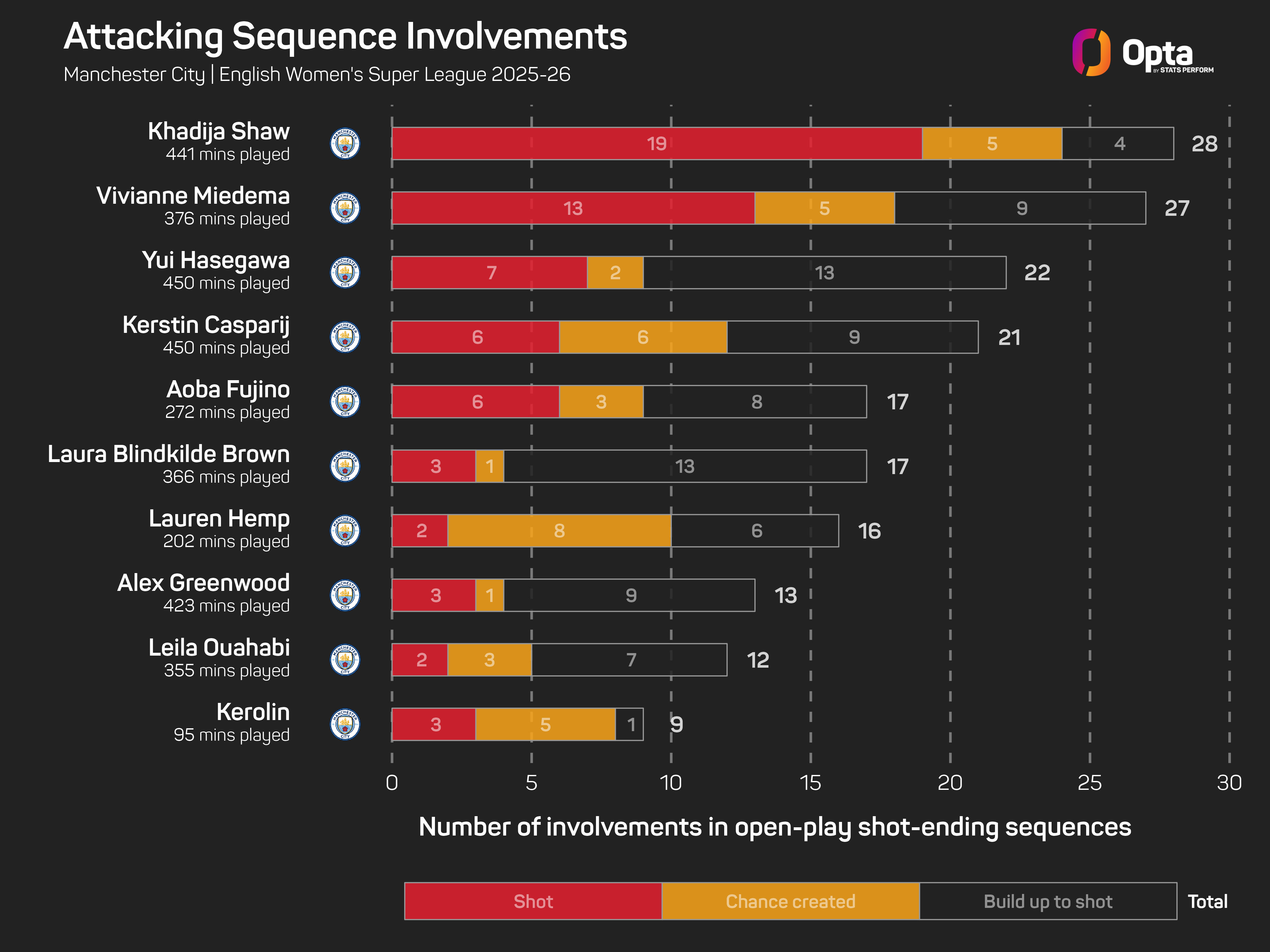 City have had the most different goalscorers in the WSL so far this season (excluding own goals), with the Citizens having nine scorers at this stage of a season for the first time since 2017-18 (10). Jeglertz's team have had more scorers than eight of the other 11 teams have scored goals.