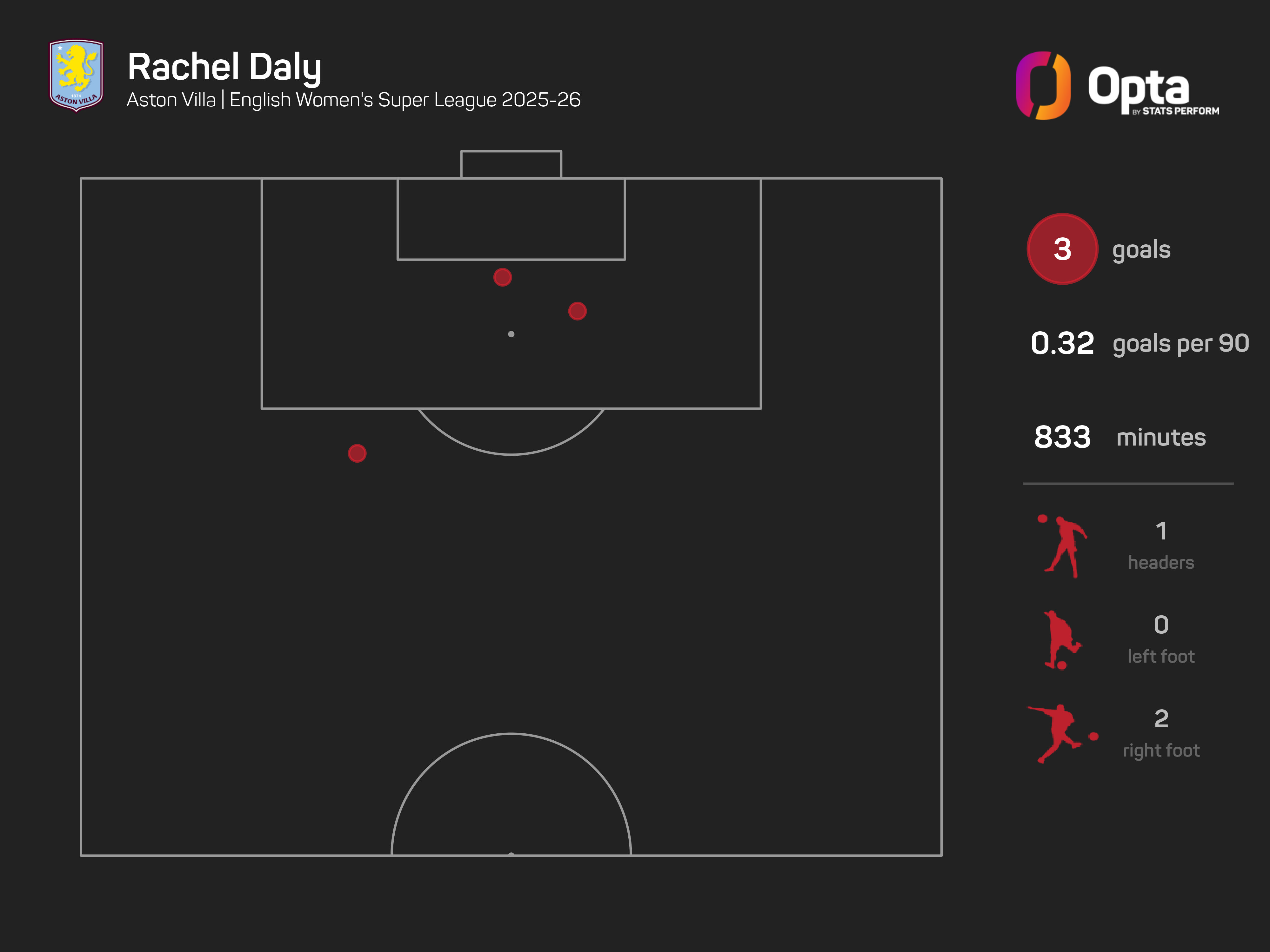 And United will need to look out for Rachel Daly, who has scored four of Villa's five WSL goals against United, also netting three goals in her last two league outings at home. She last netted in three straight at Villa Park in November 2023, a run of four that included a strike versus the Red Devils.