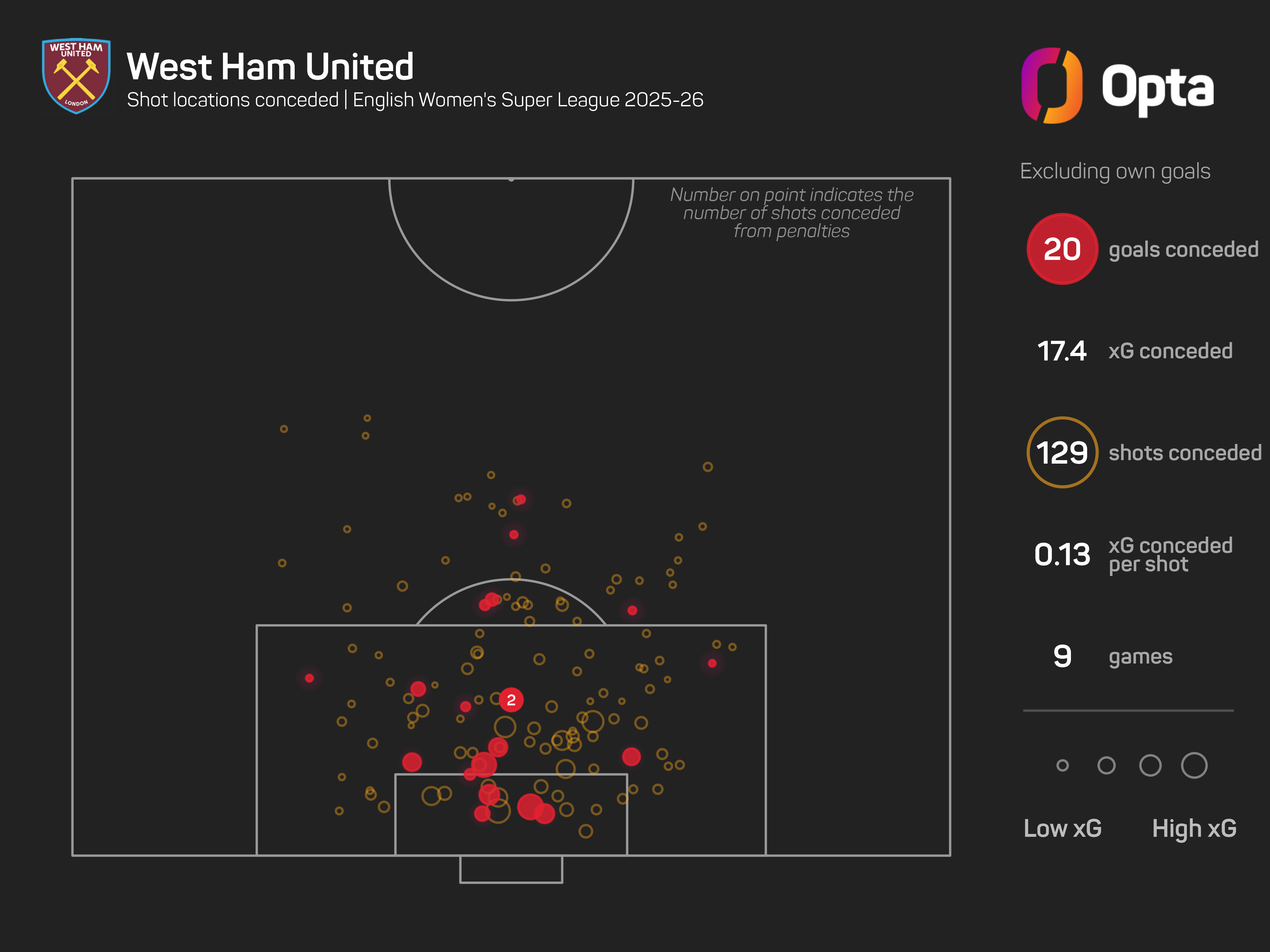 And the Hammers are one of three teams yet to keep a clean sheet in the competition this season (also Everton and Liverpool) – they have faced the most shots (129) and have the highest expected goals against figure (17.4 xGA).