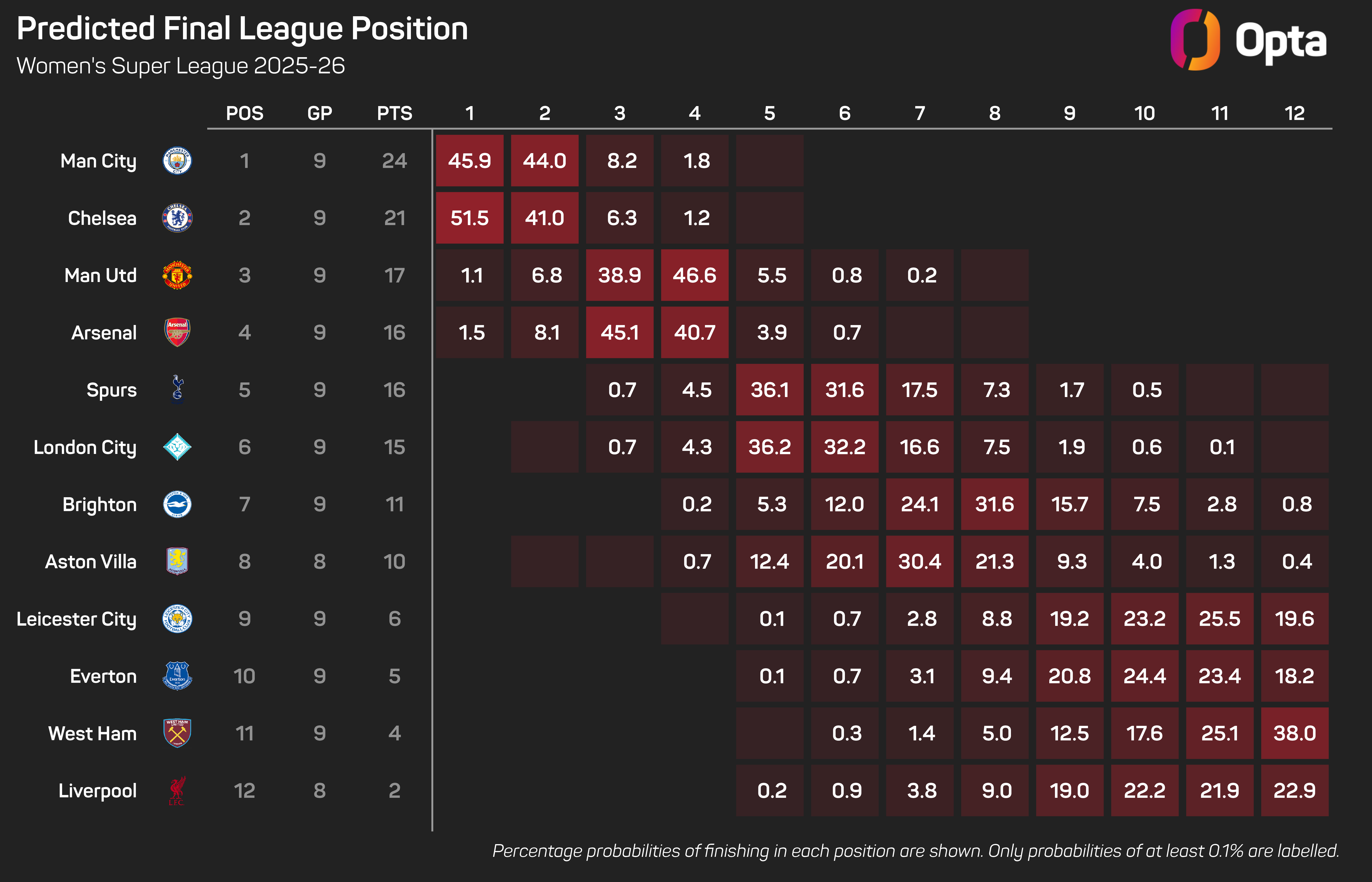 Liverpool have failed to win any of their first nine WSL games this season but have drawn each of their last two. Arsenal could also draw three in a row in the league, with the chance of a draw sitting at 13.1%.